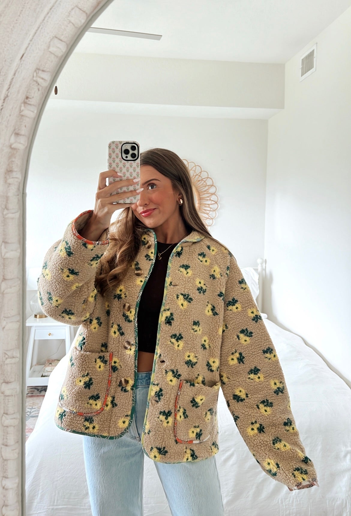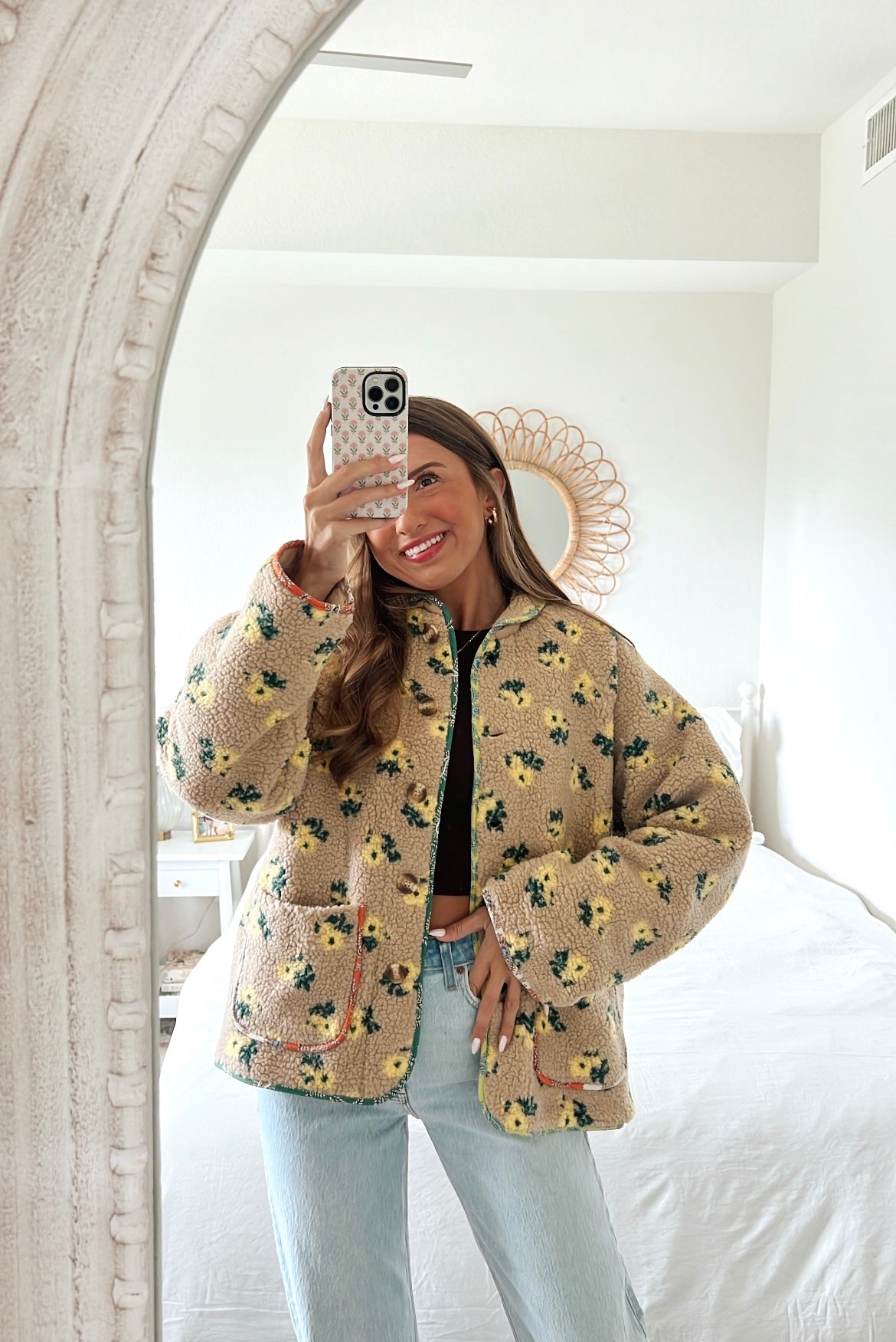 Taupe and yellow floral sherpa. long sleeve with contrast piping print detailing