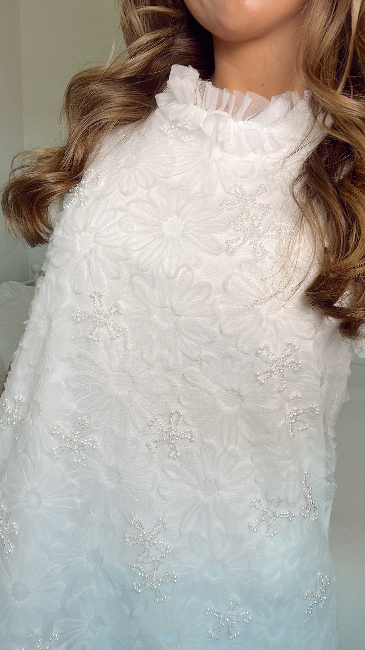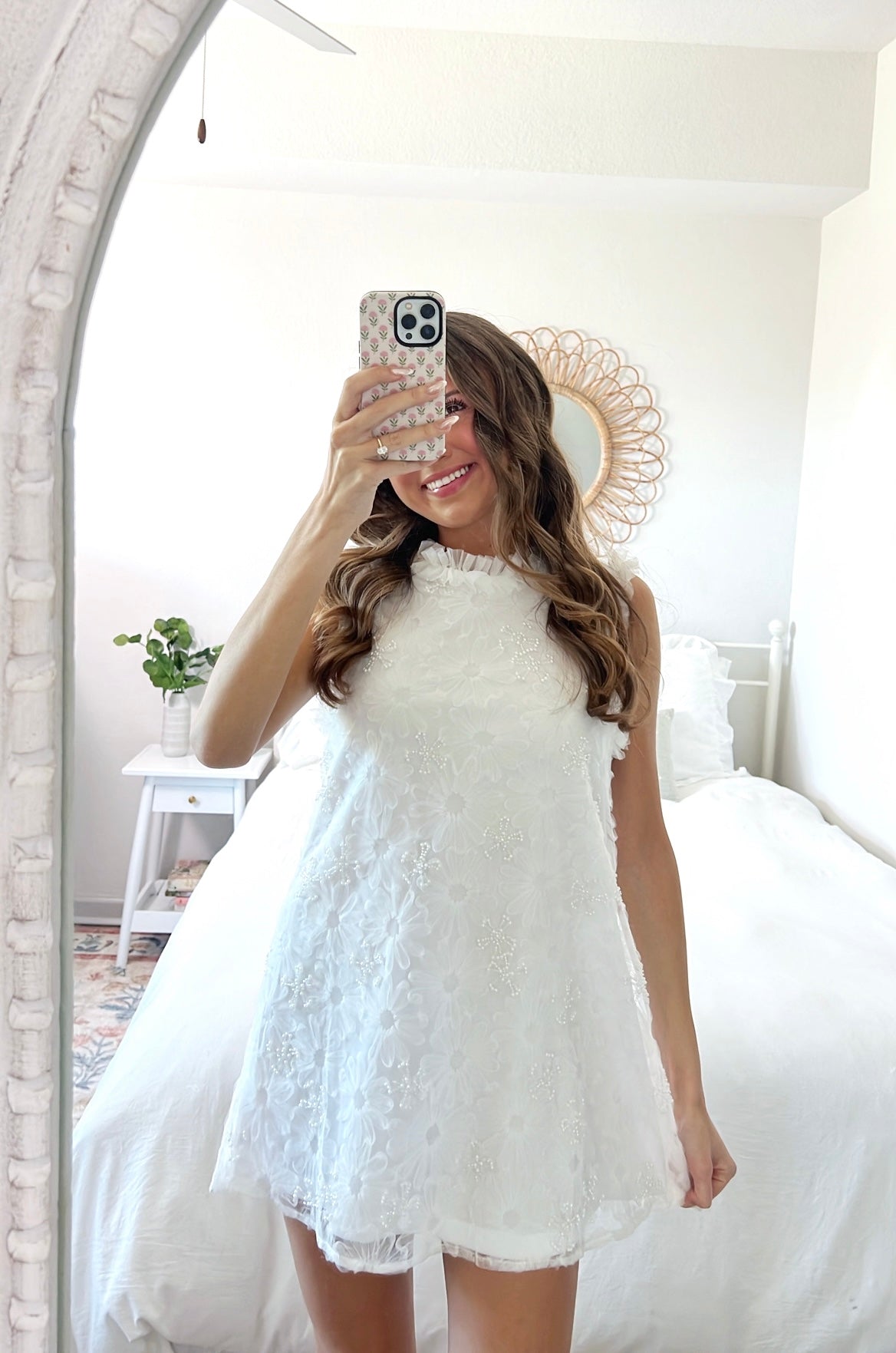 Floral textured embellished sleeveless mini dress. Back open keyhole with button detail closure. Lining.