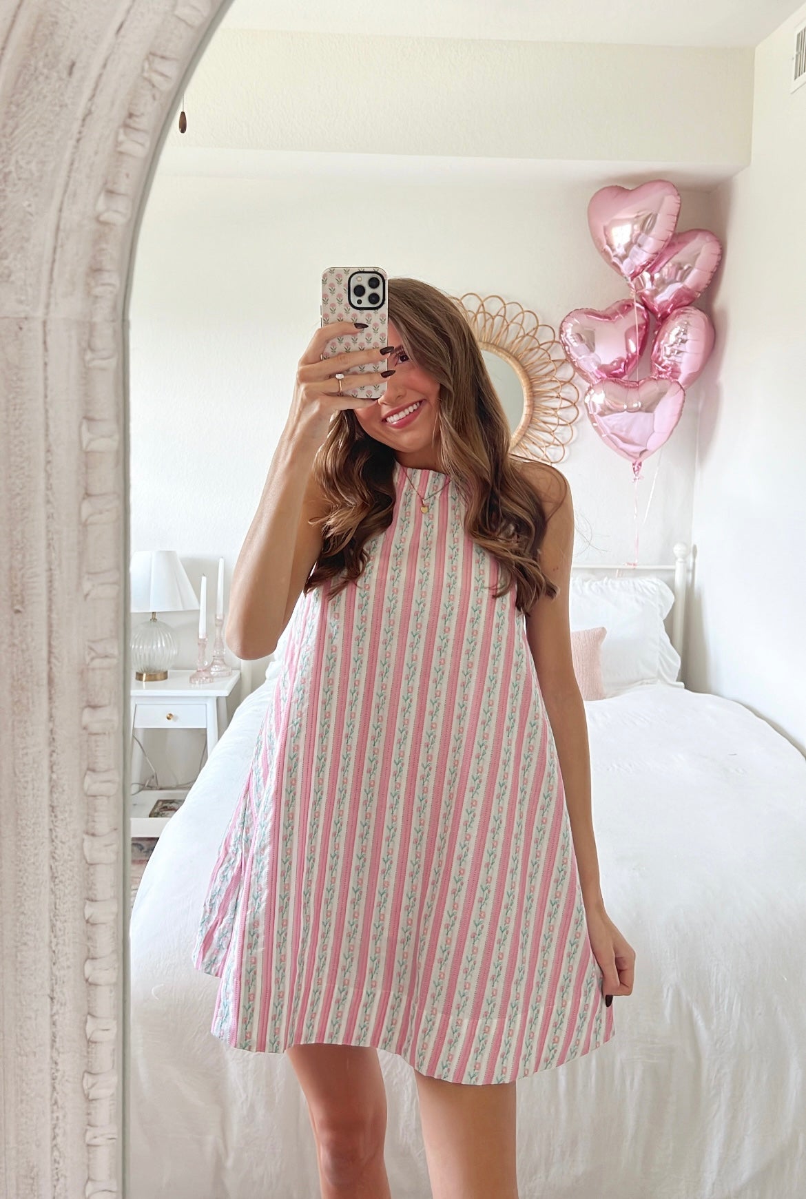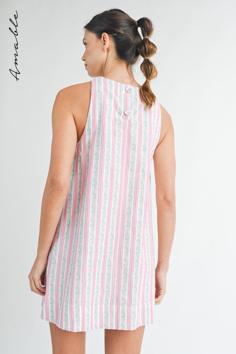 Sleeveless floral print a-line mini dress. Back neckline button closure. Lining.