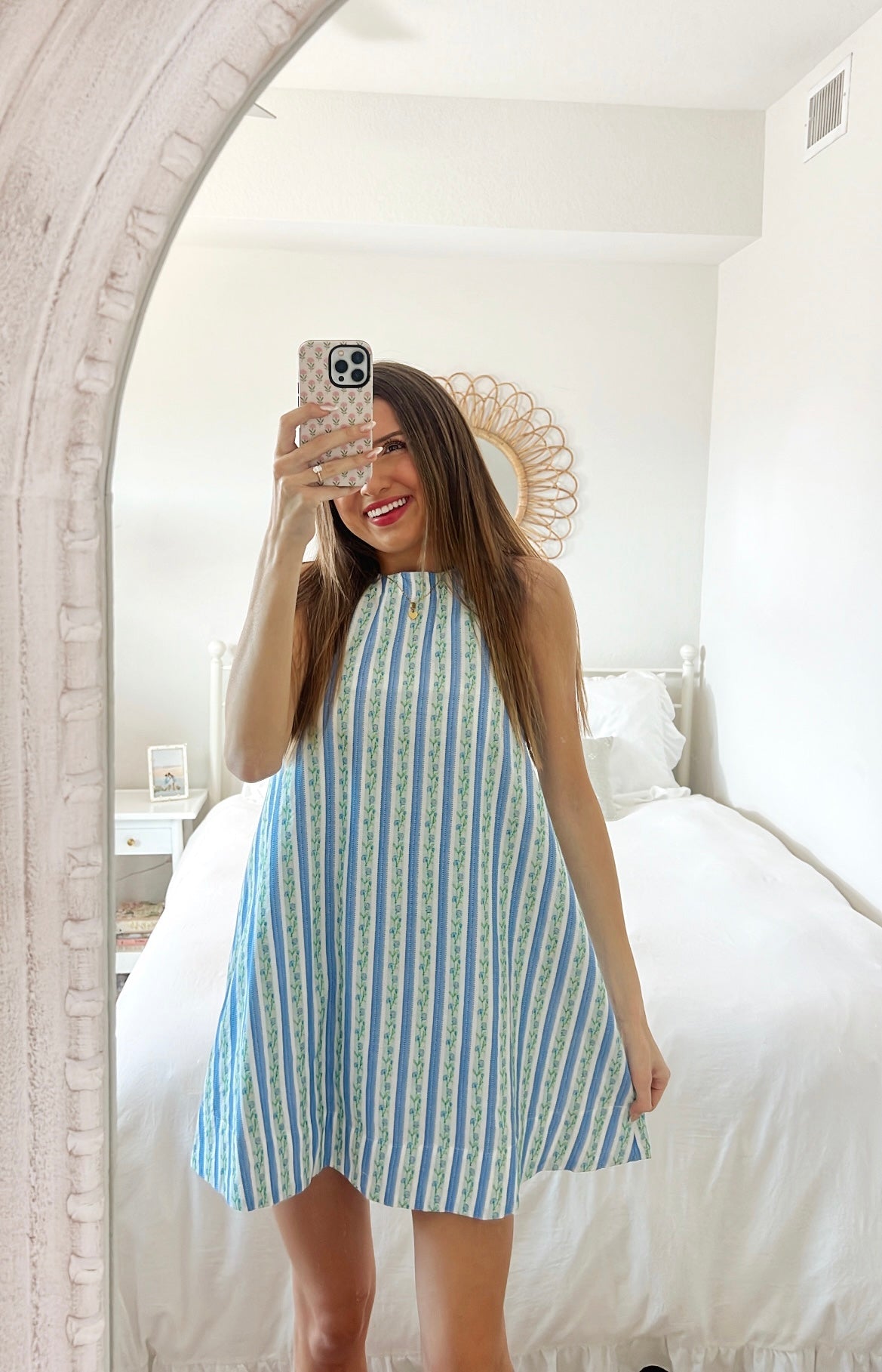 Sleeveless floral print a-line mini dress. Back neckline button closure. Lining.