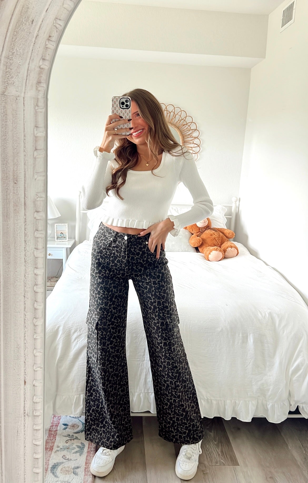 Mid rise wide cargo pants in grey leopard