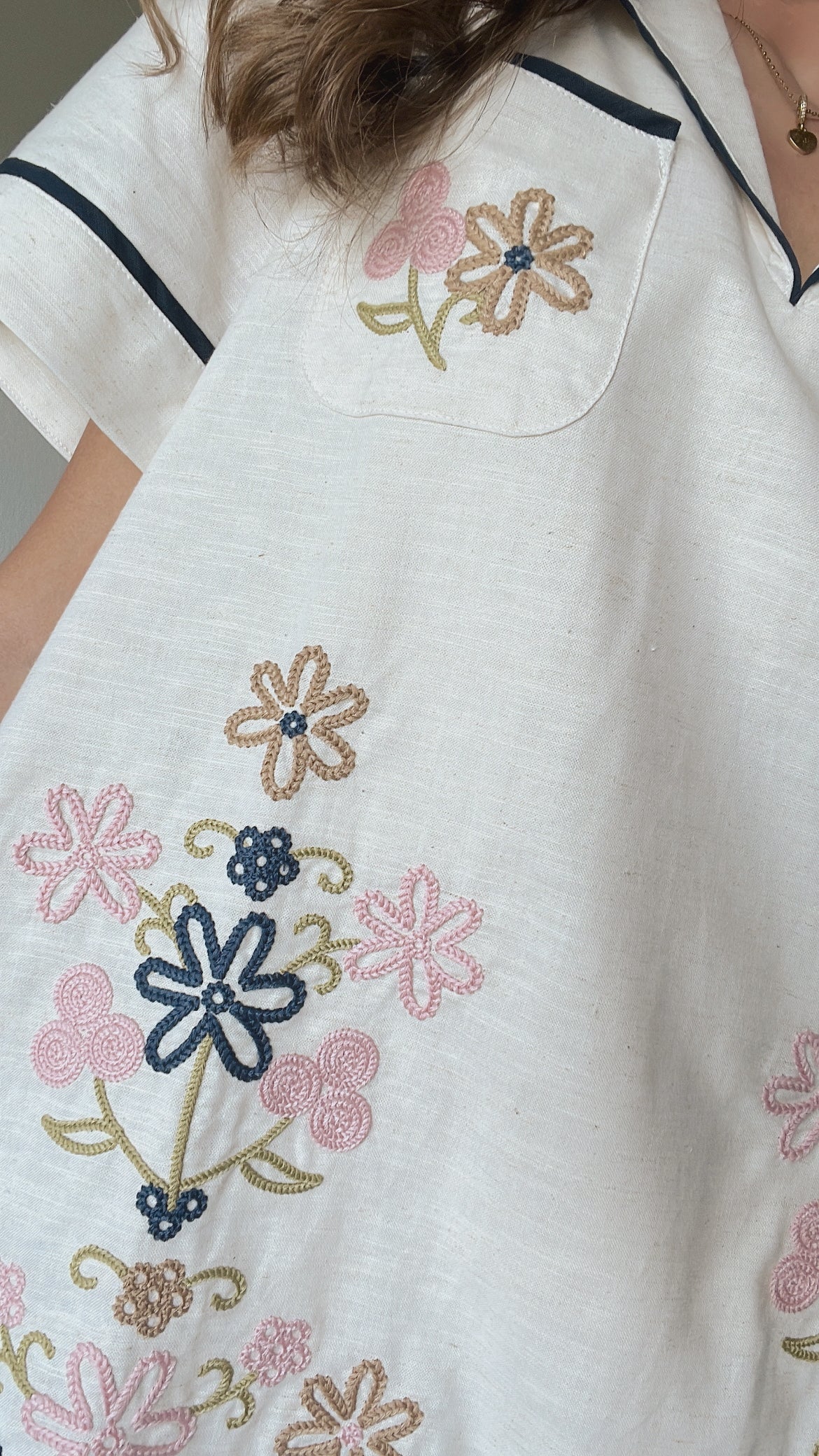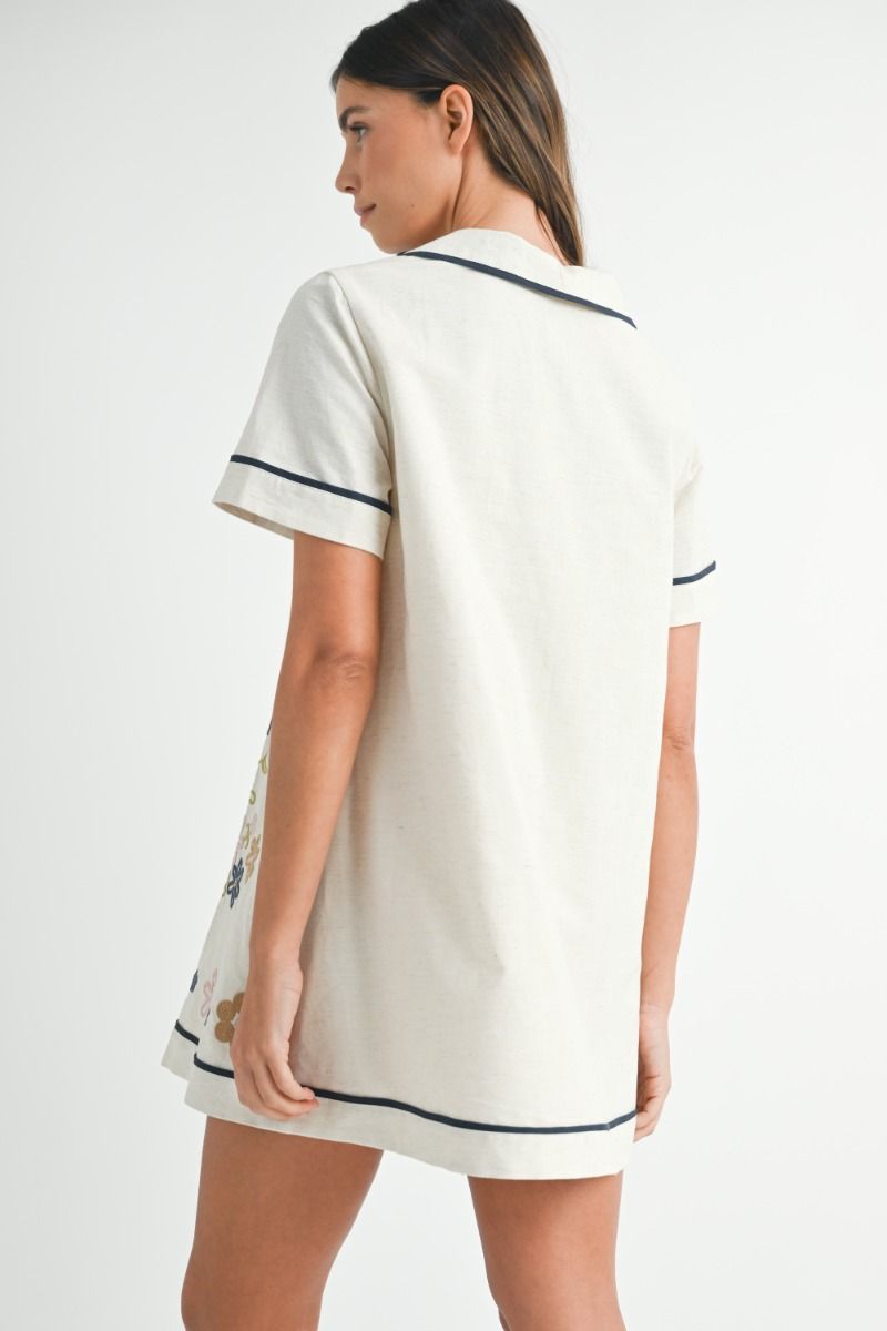 Short sleeve linen mix floral embroidery collared mini dress with contrast binding and collar detail. Lining.