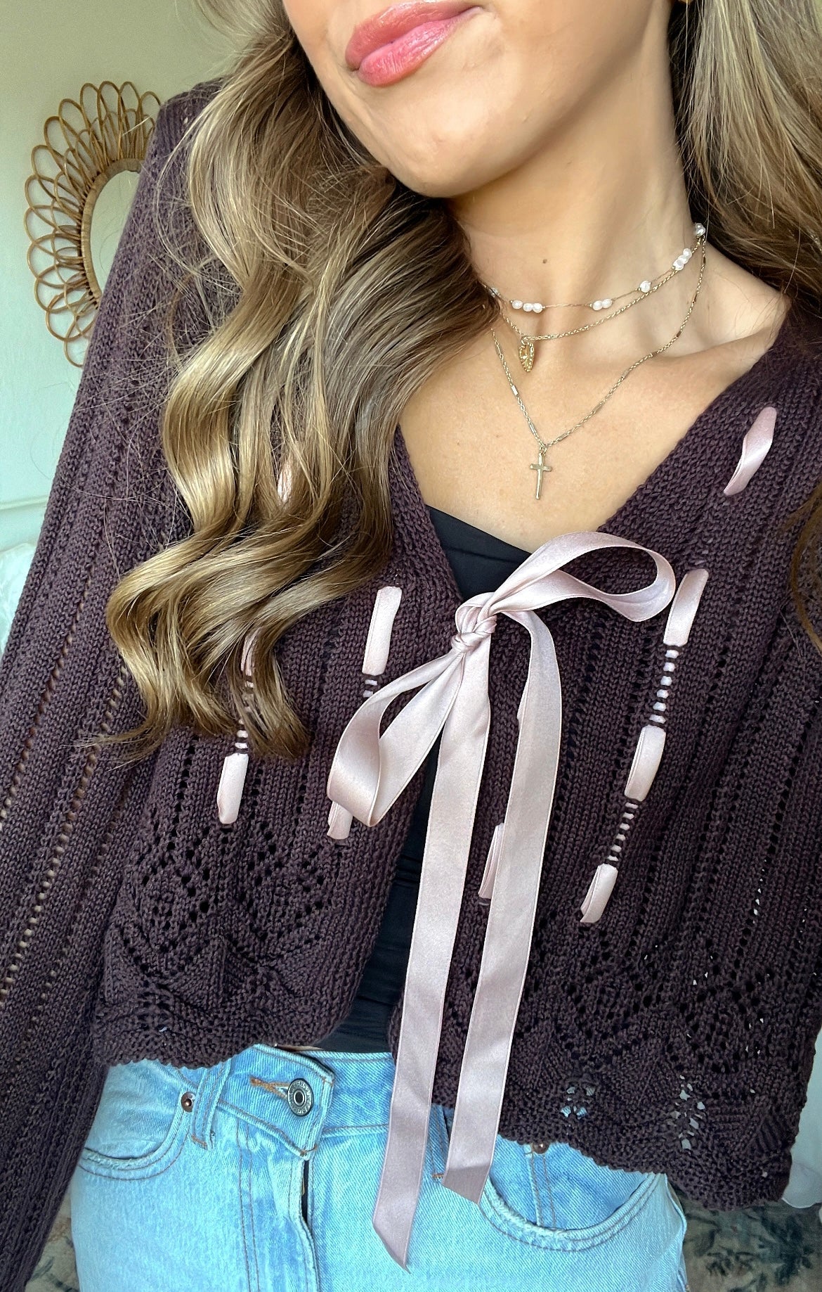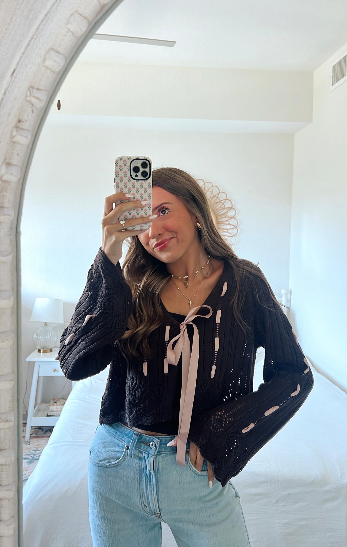 Laced ribbon cardigan with center ribbon bow tie (open front)
