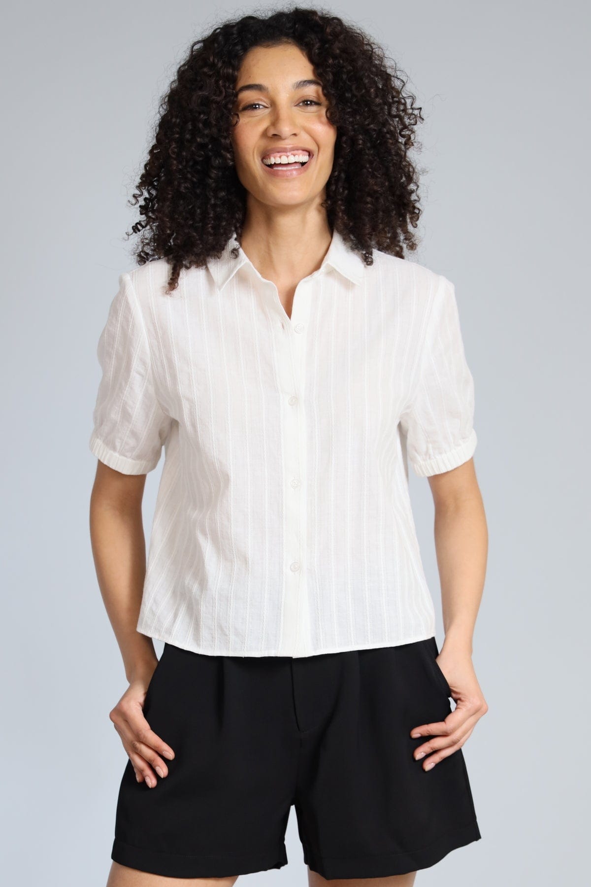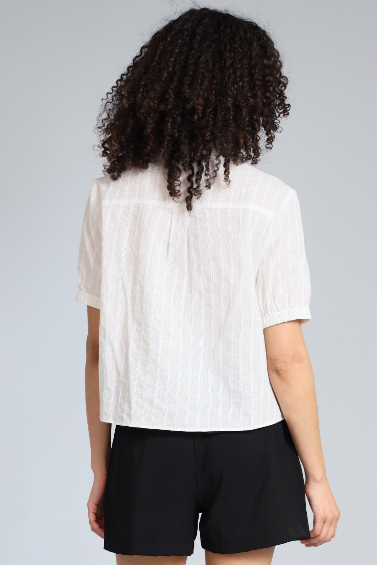 The Cotton Dobby Cropped Shirt is a must-have for your wardrobe. This shirt features a classic collared neckline and button-down front. The cropped silhouette adds a modern touch. while the elastic cuffs on the sleeves provide a comfortable and stylish finish.
