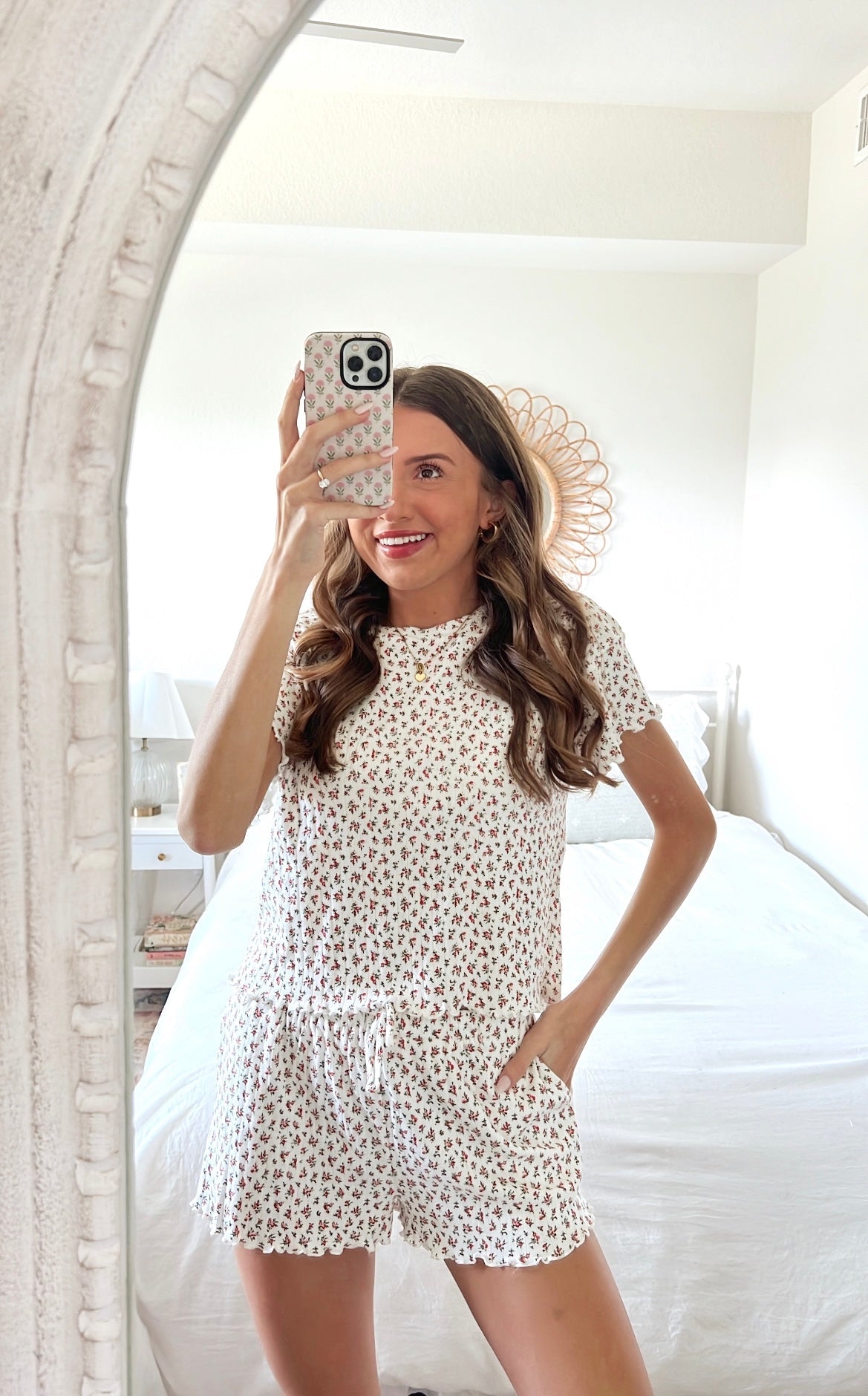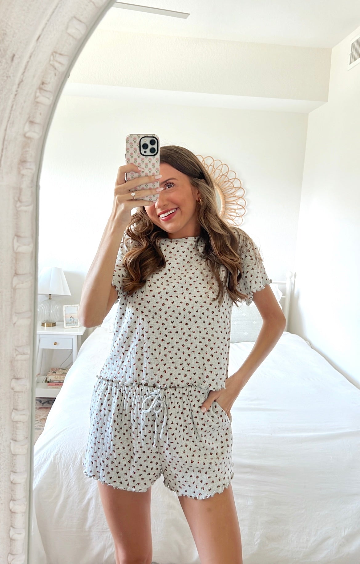 Ditsy floral bouquets lounge set - grey & white options. The top features a round neckline. short sleeves. and lettuce edges on the sleeves and hem. It also has shorts with a high drawstring waist and side pockets. Includes Top and Bottom