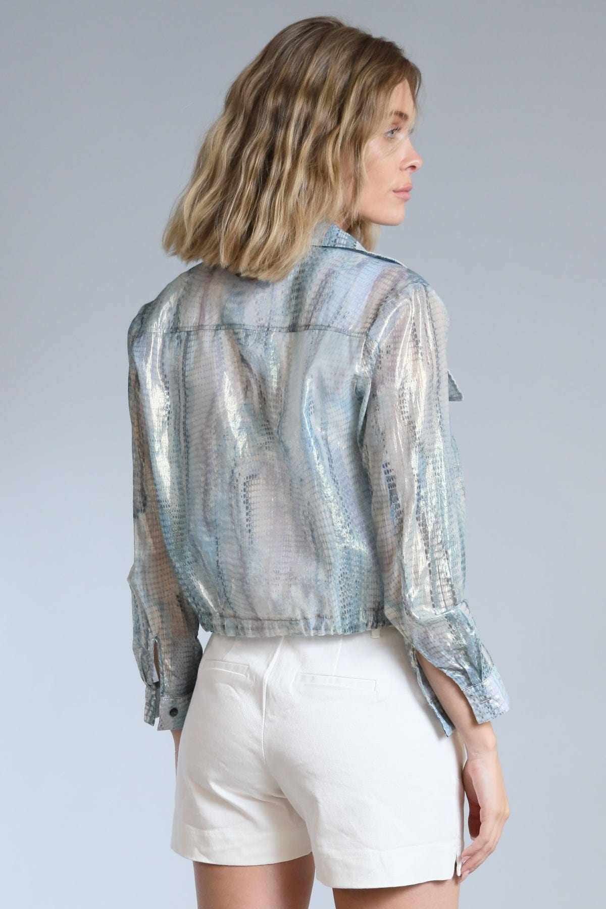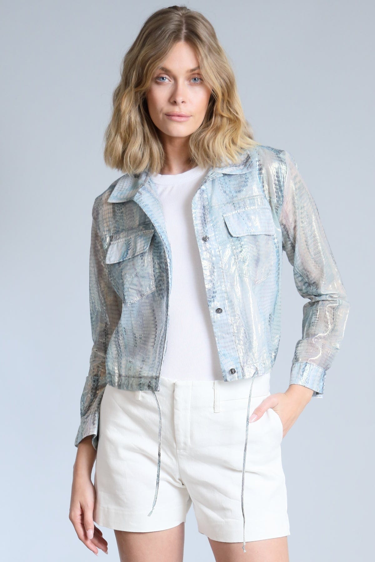 Looking for a shacket that's a little bit luxe and a whole lot of cool? We've blended soft cotton with the smooth touch of silk to create a shacket that feels amazing. Then. we added a subtle foil snake print that catches the light and adds an intriguing texture. It's the perfect weight for layering.