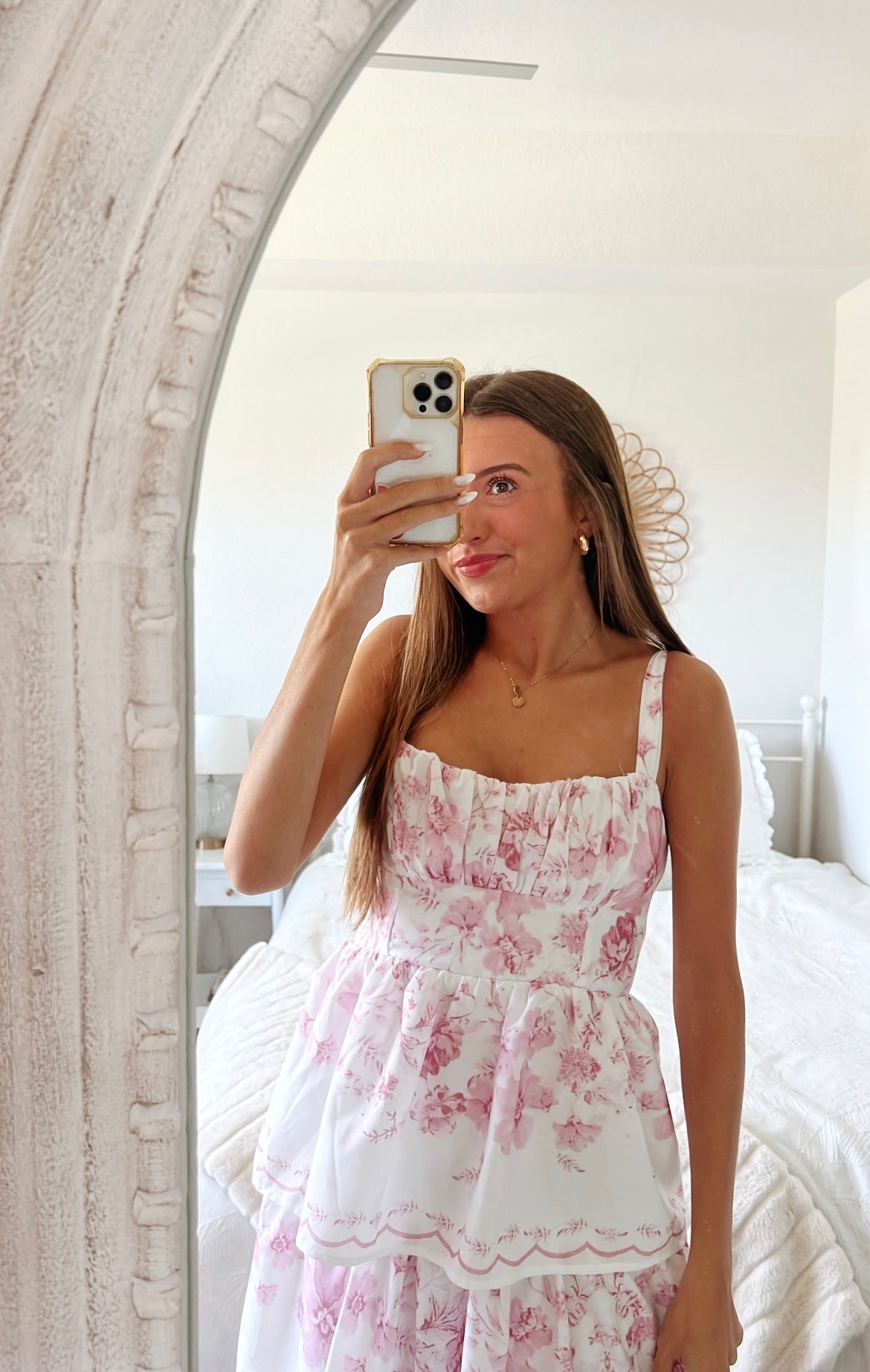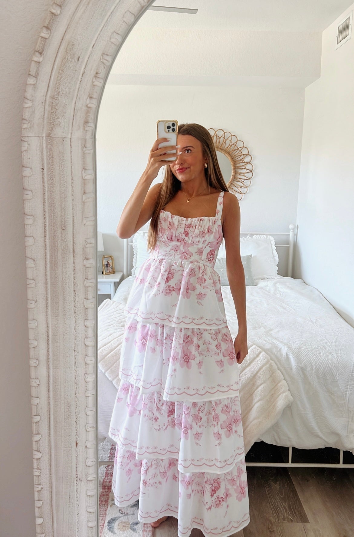 White and pink floral tiered maxi dress