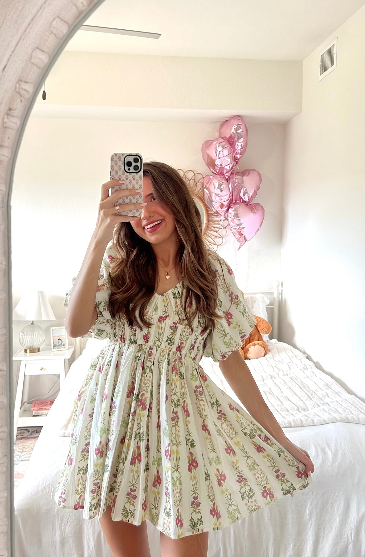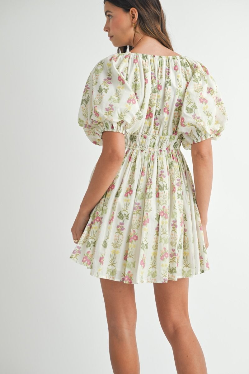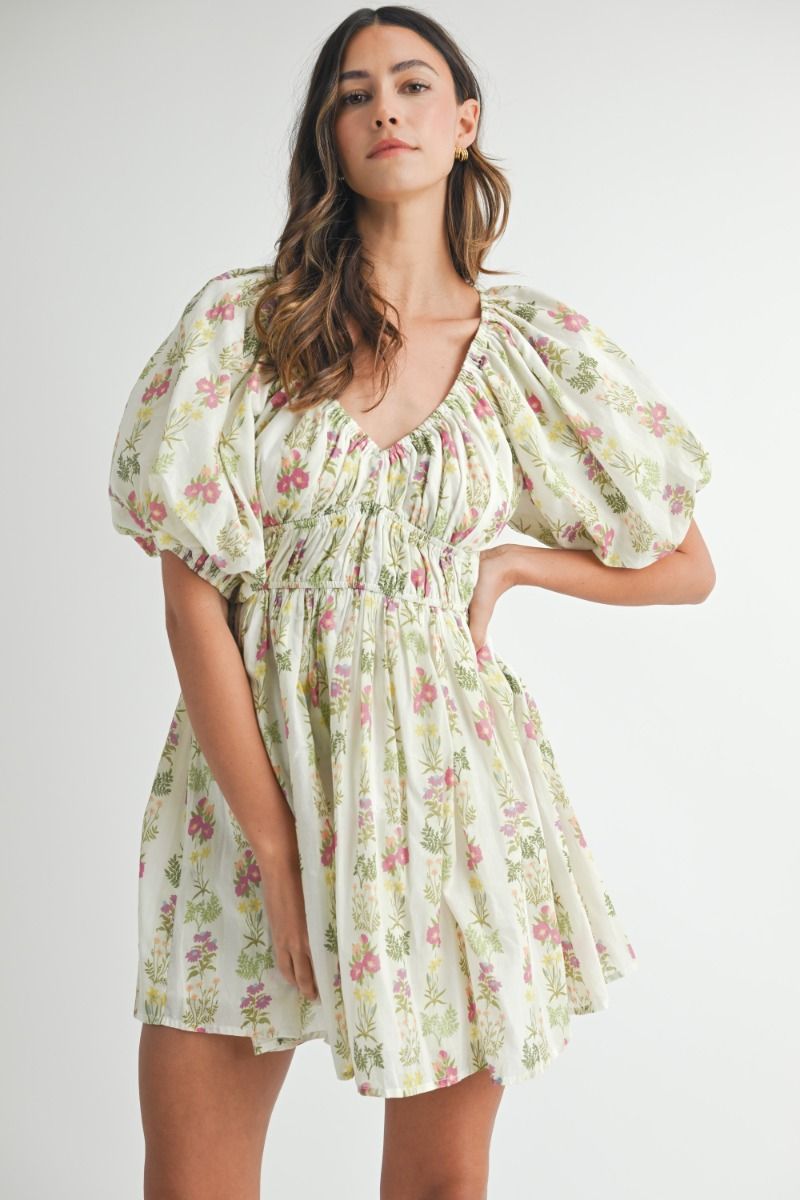 Floral print short raglan puff sleeve v-neck shirring waist detail babydoll mini dress