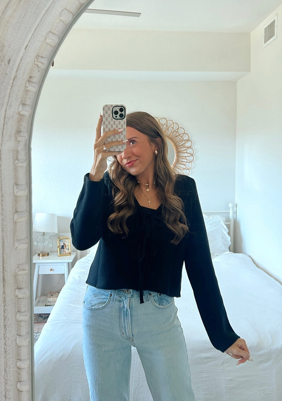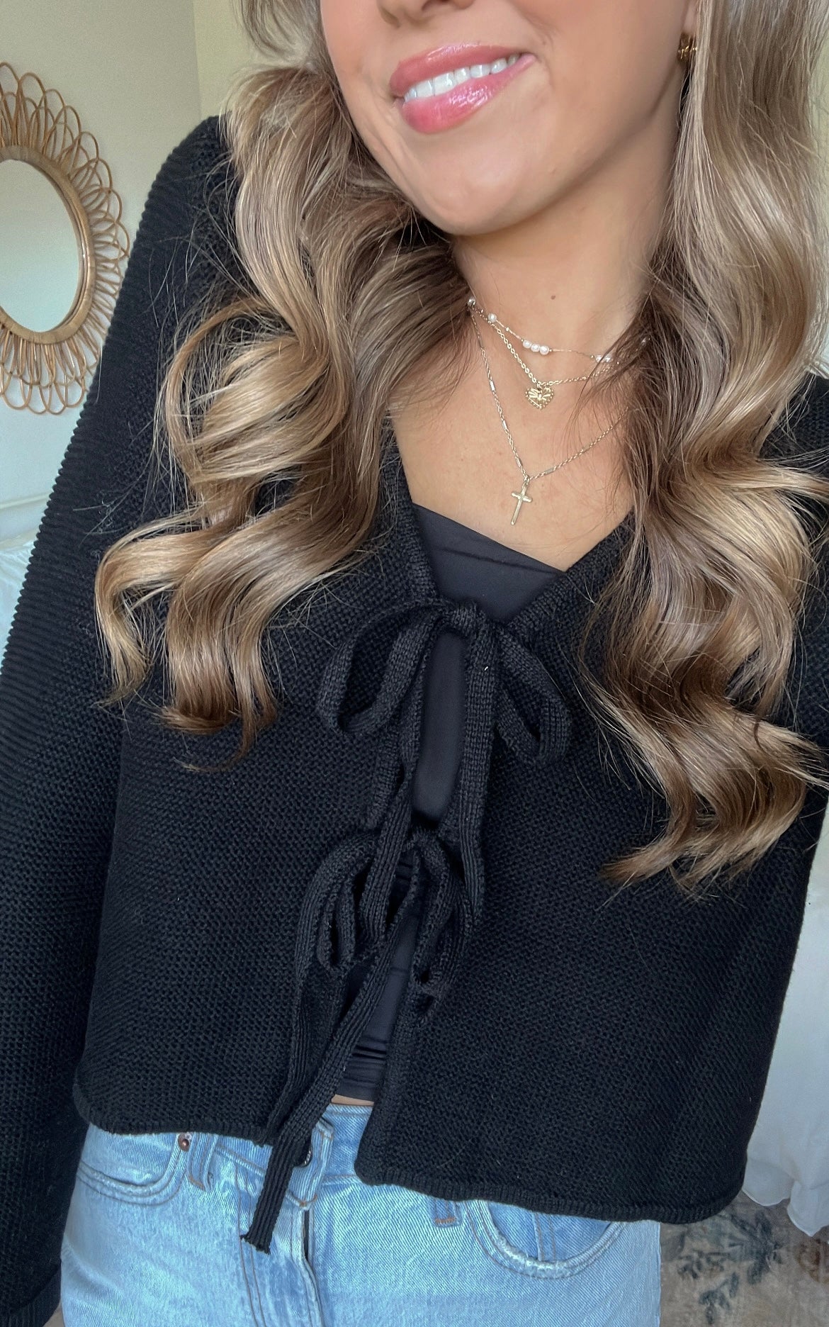 Black long sleeve knit bow tie front cardigan