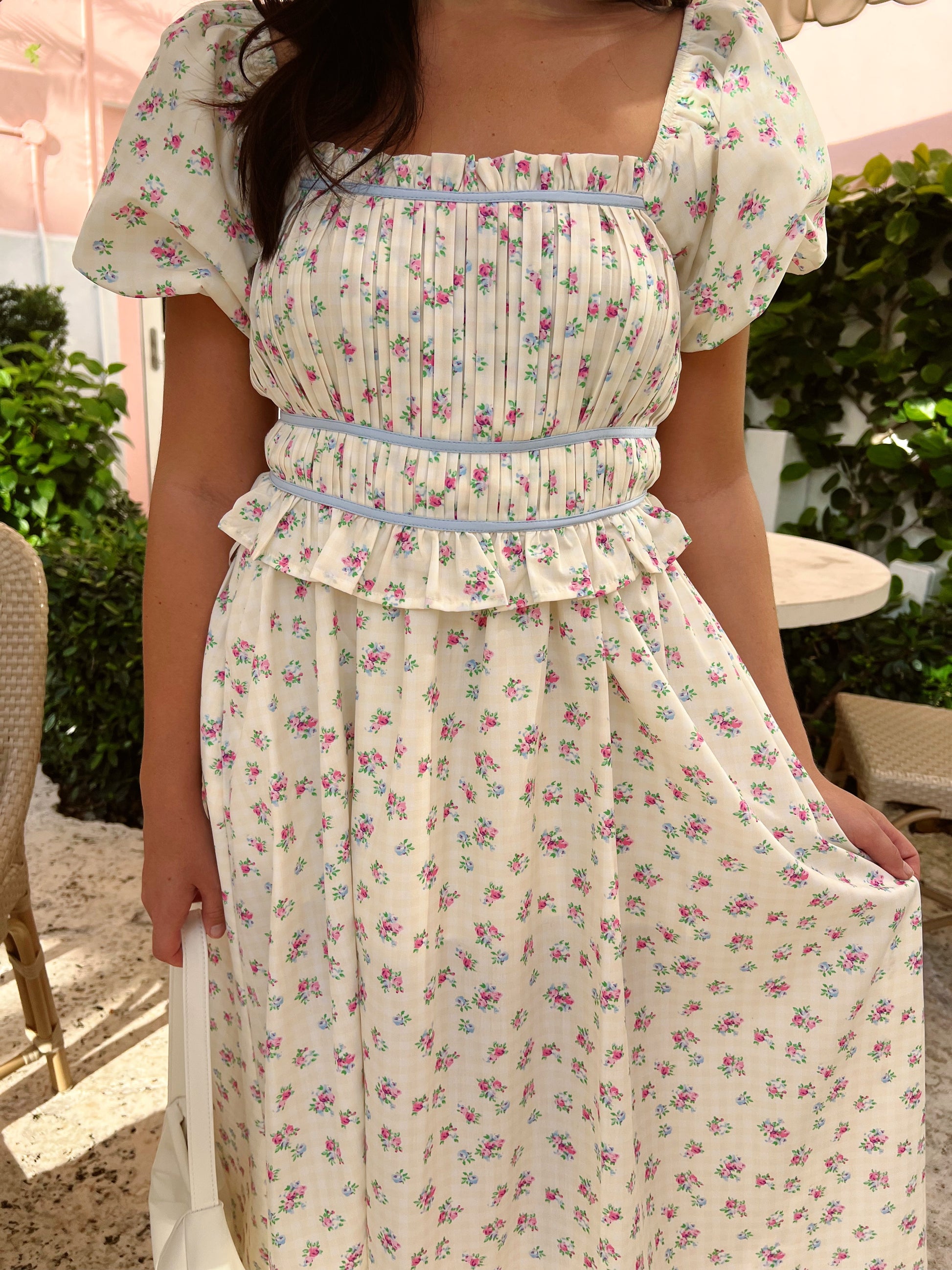 Light yellow gingham set featuring blue and pink floral printing.