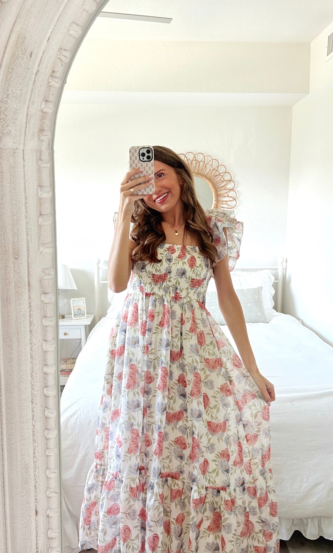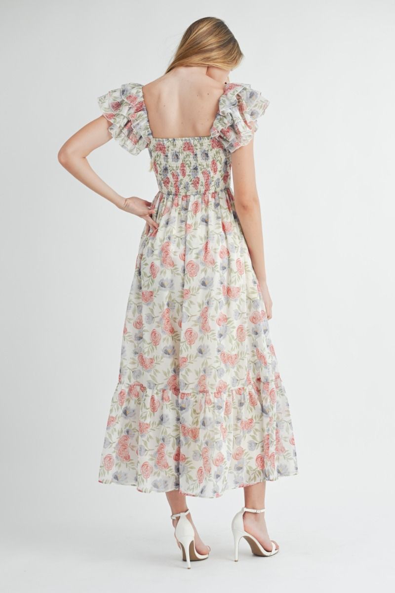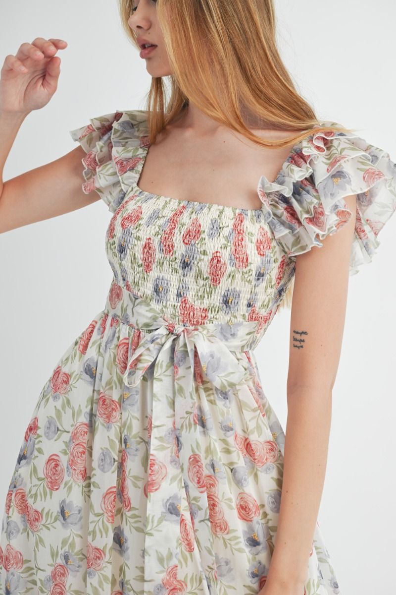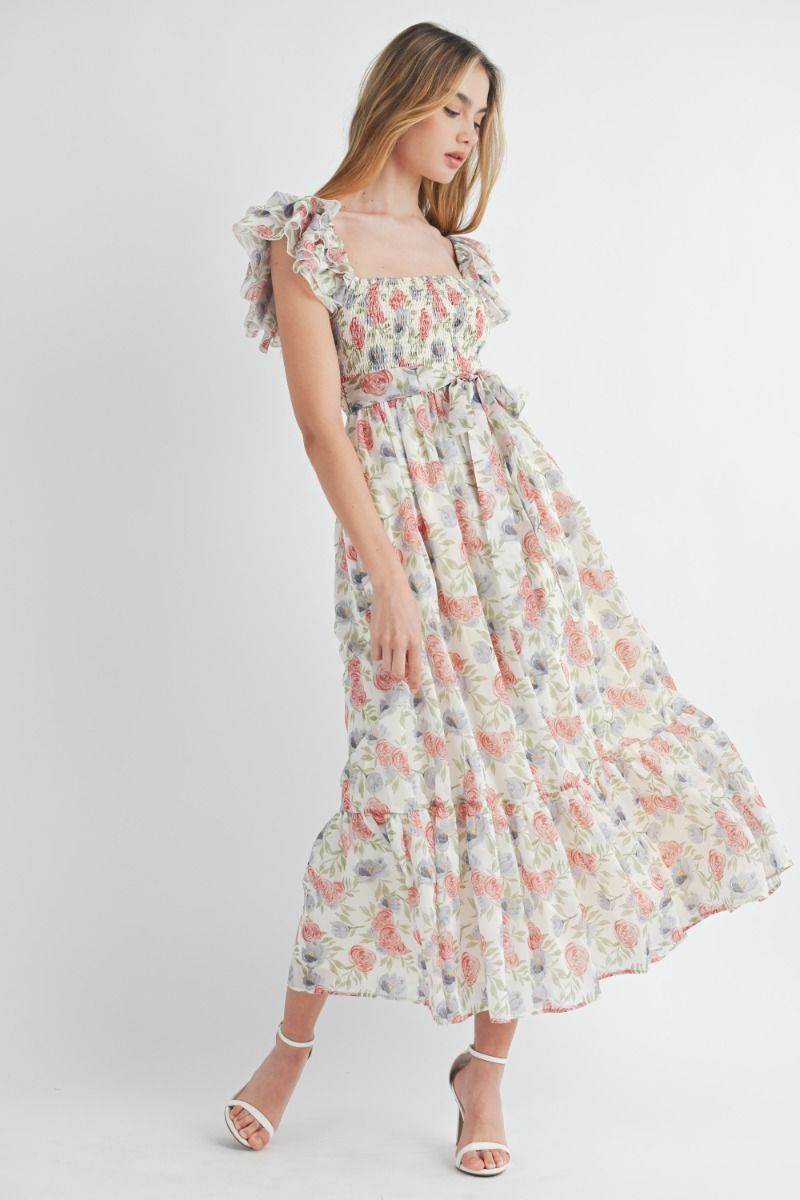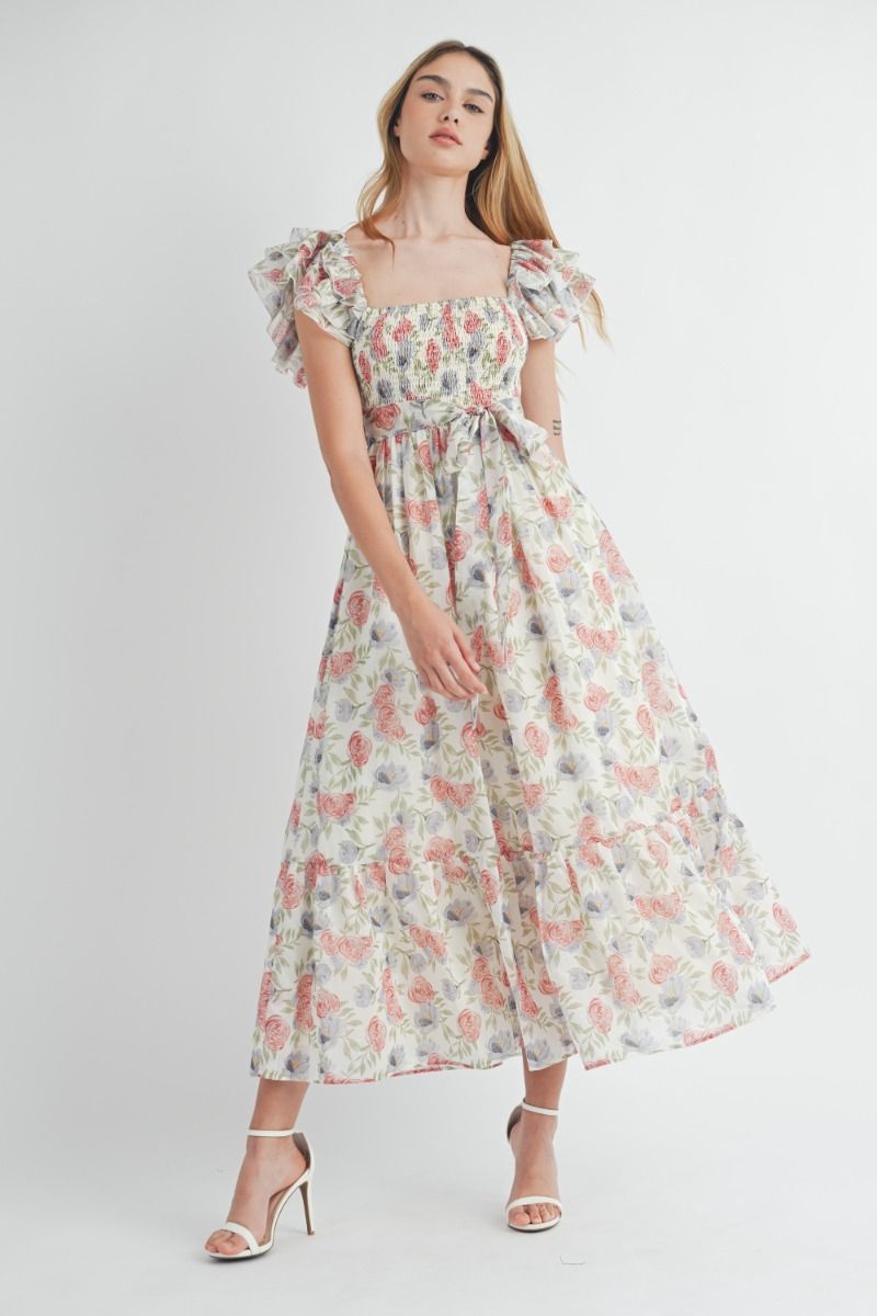 Rose floral print ruffle sleeve square neckline smocked bust tiered midi dress with self tie detail. Lining.