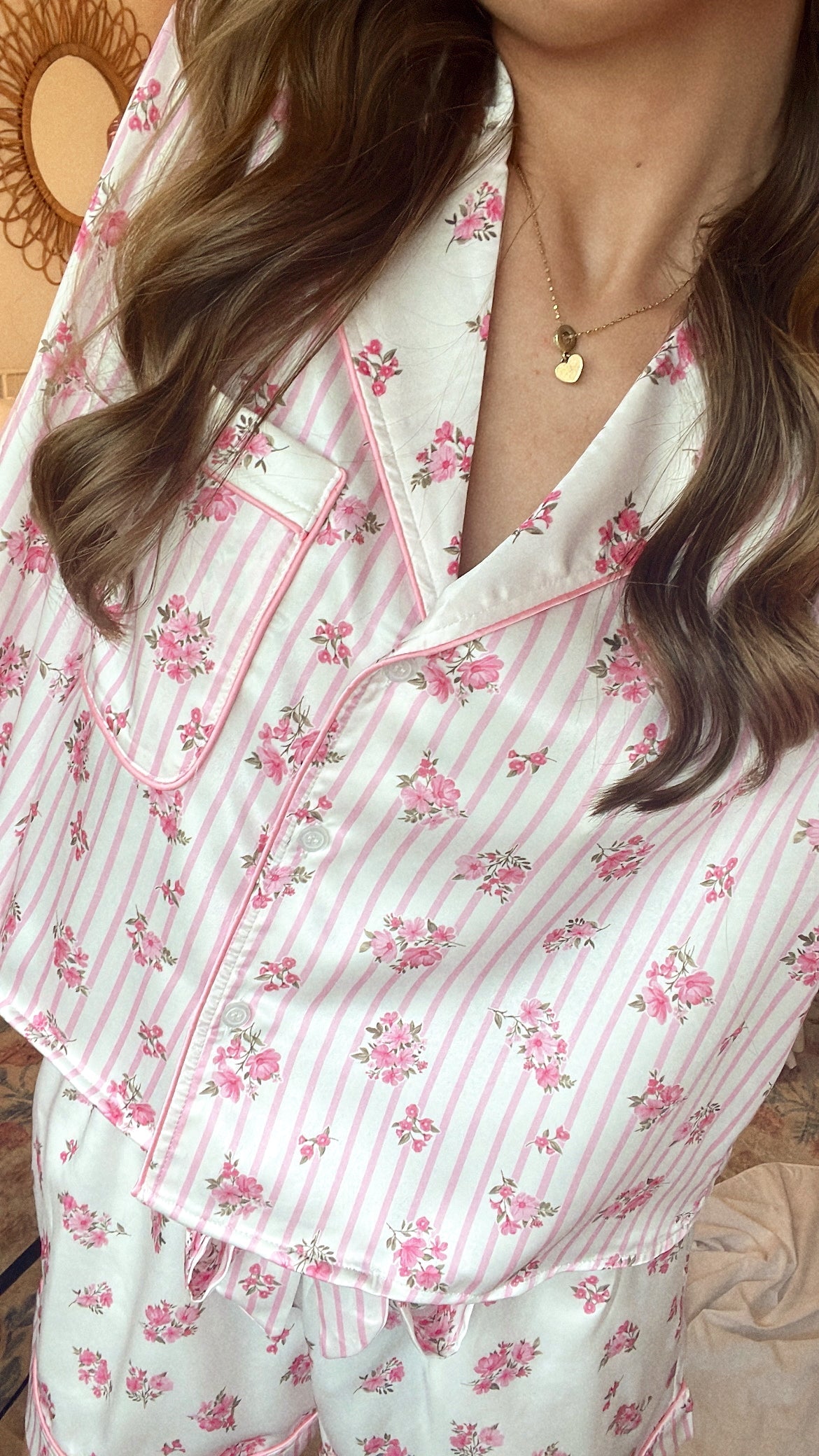 COMES AS A SET ONLY - white & pink. stripe floral print satin pajamas