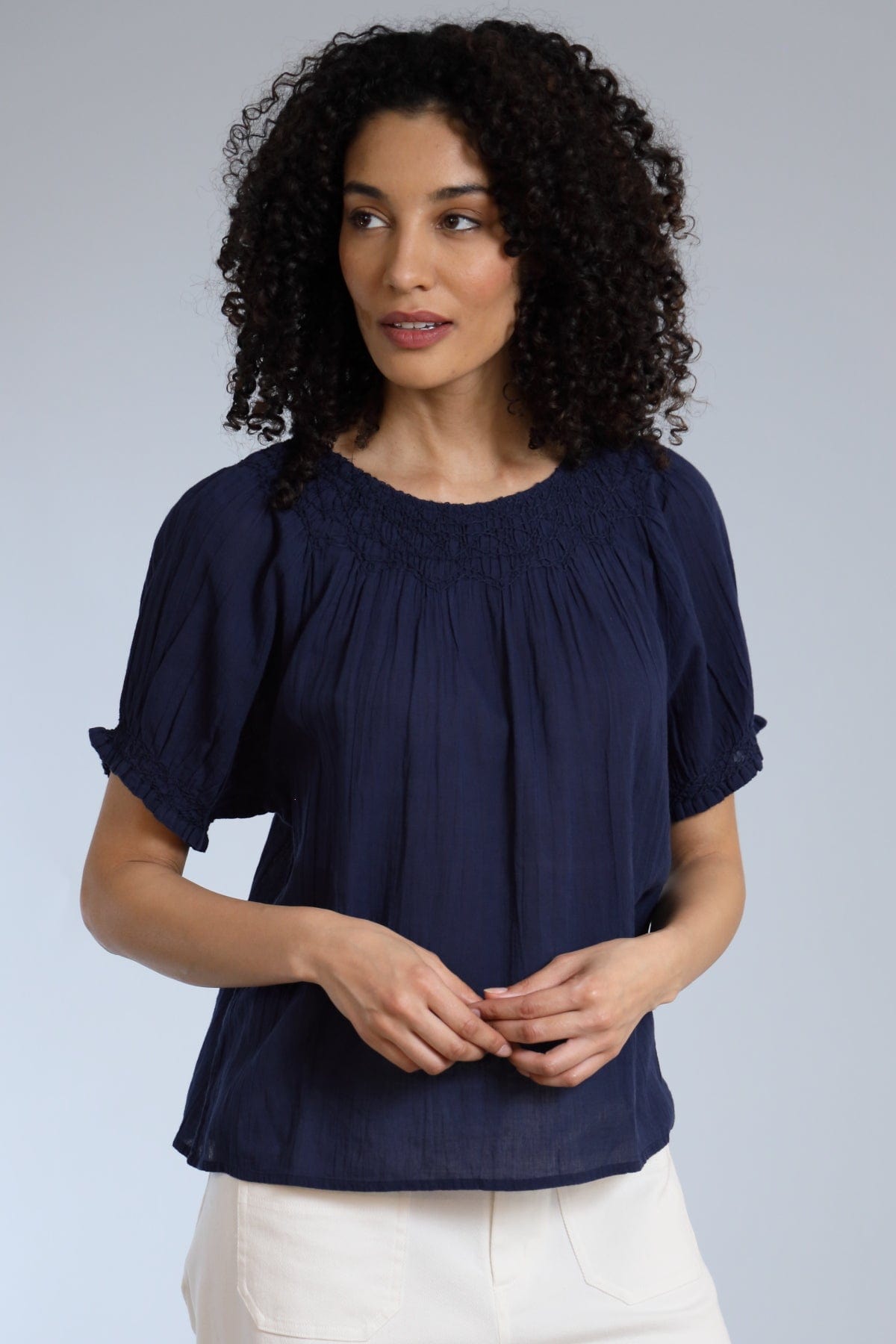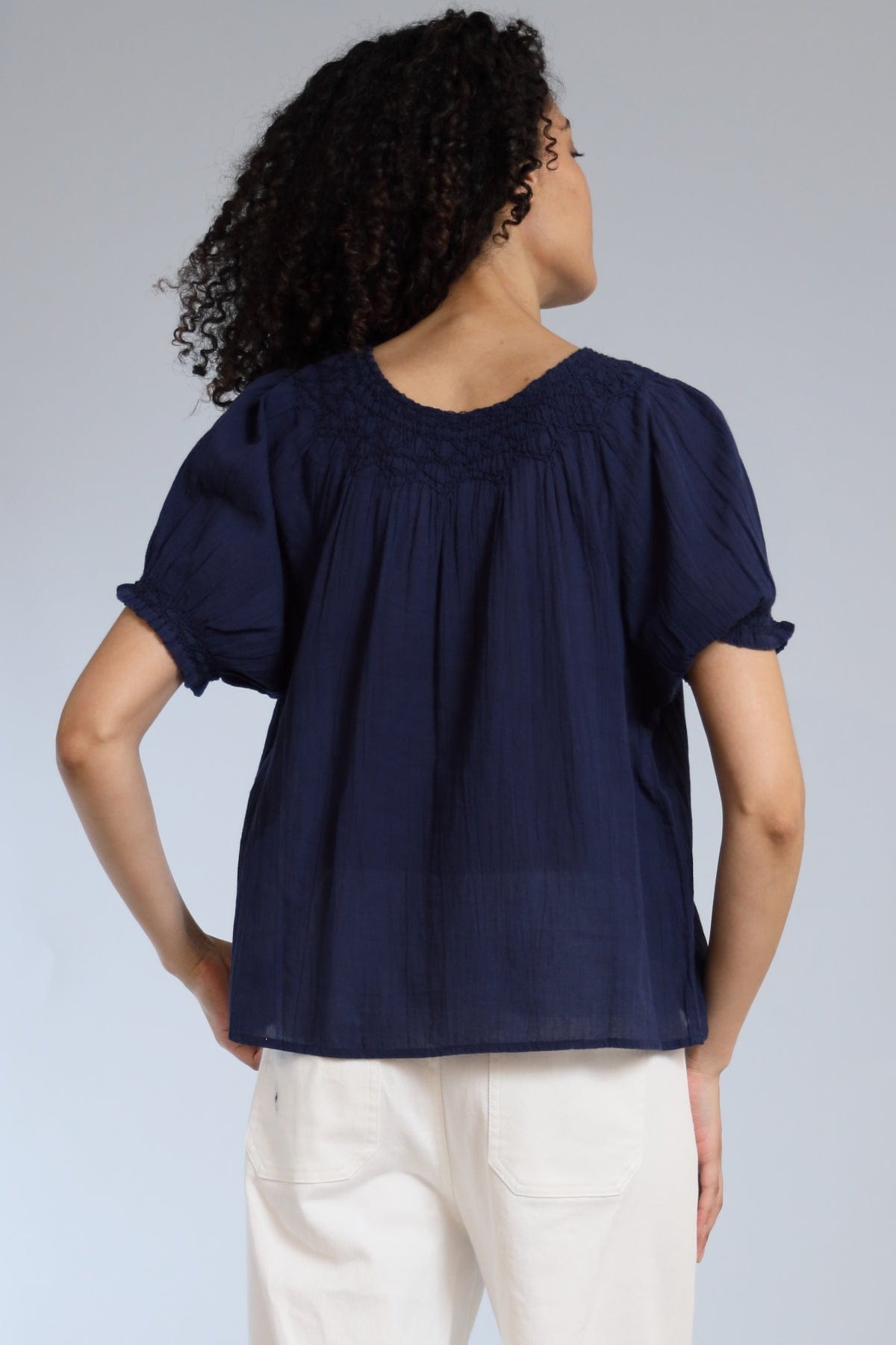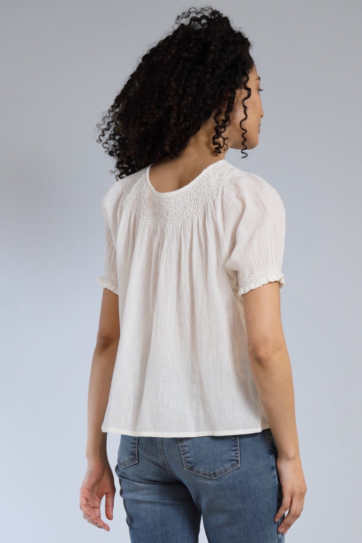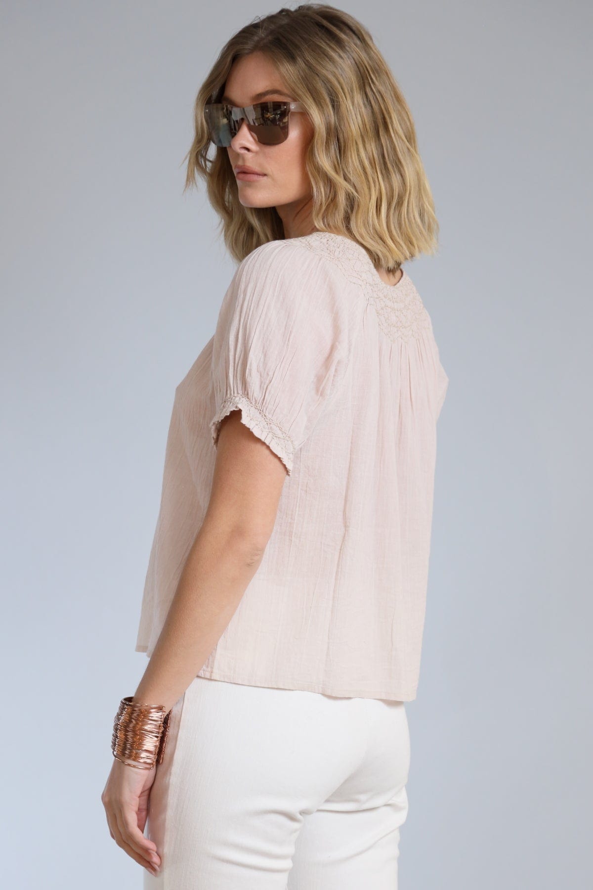 Bohemian charm meets breezy comfort. Our embroidered Crinkle Top is a delightful addition to your warm-weather wardrobe. this short sleeve top features delicate embroidery around the neckline. adding a touch of artisanal detail.