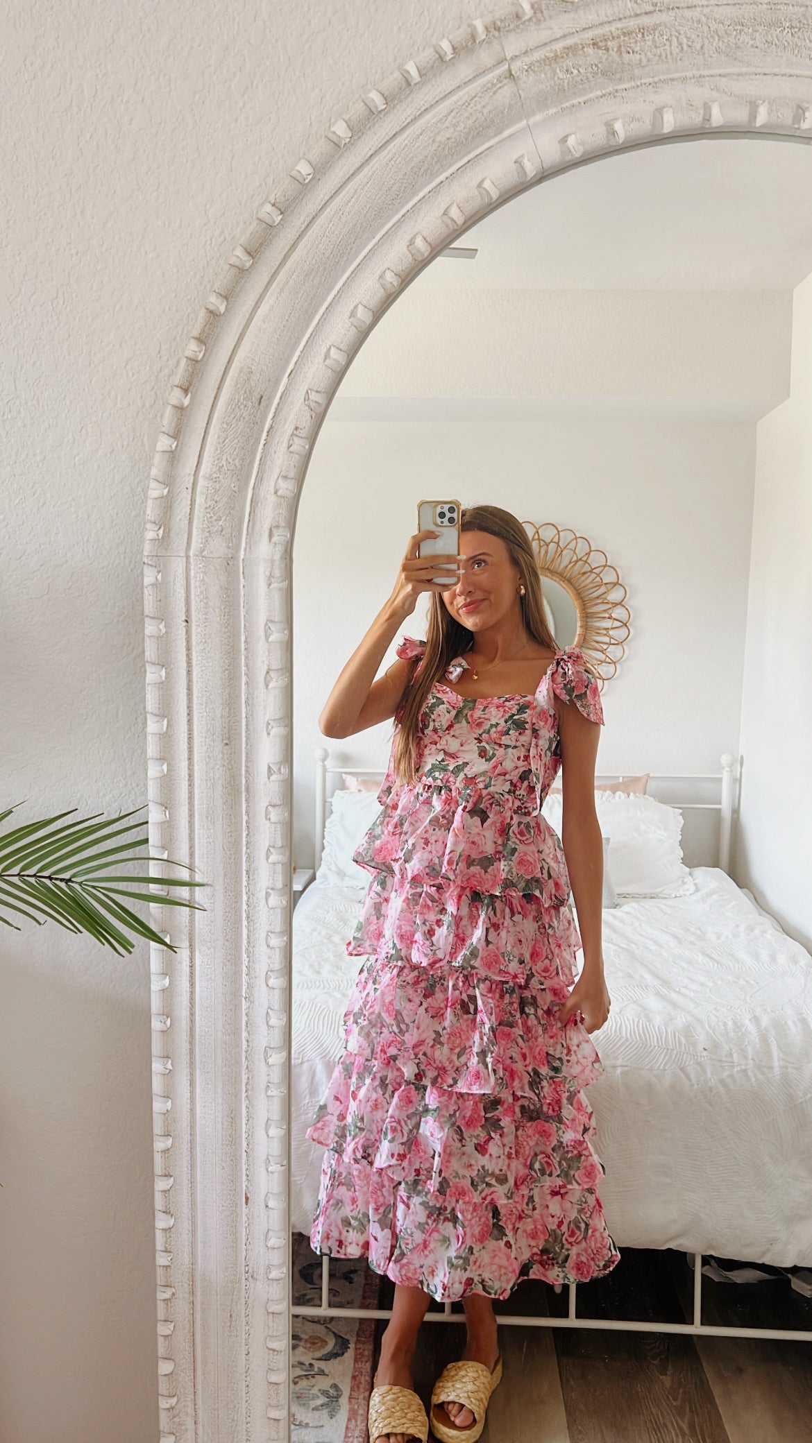 Floral printed organza midi tiered dress with adjustable bow straps