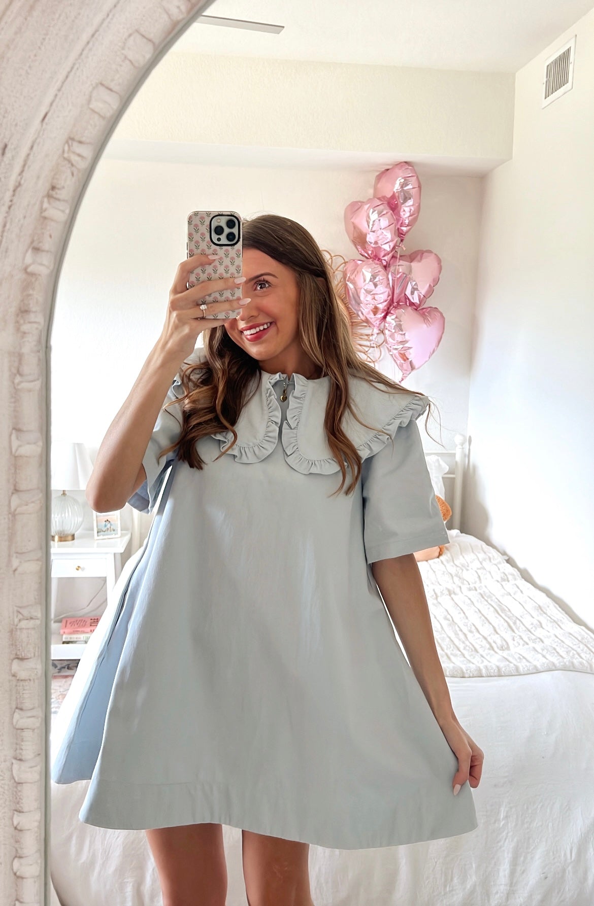 Solid light denim short sleeve ruffle detail peter pan collar dress with side pocket detail