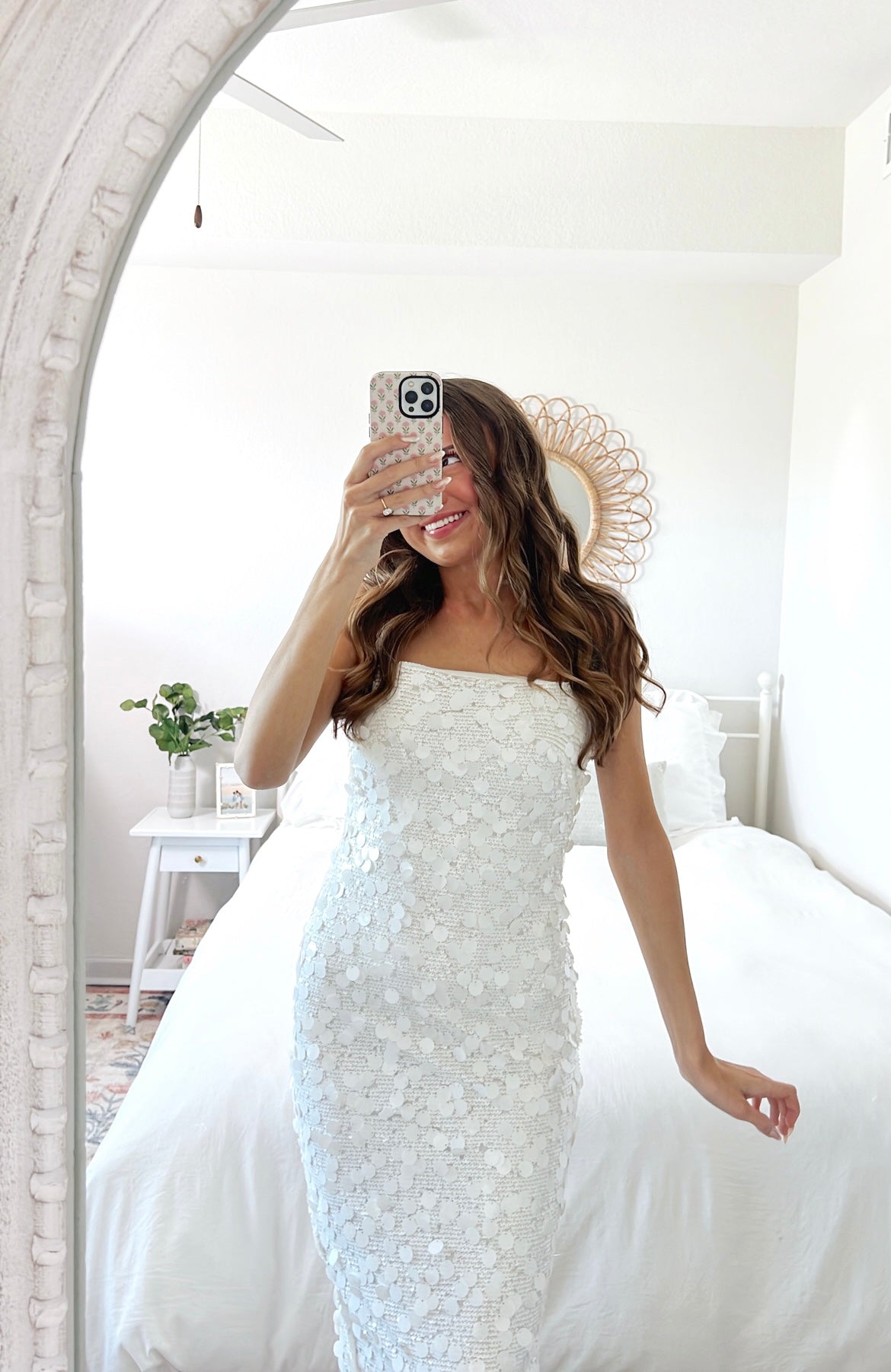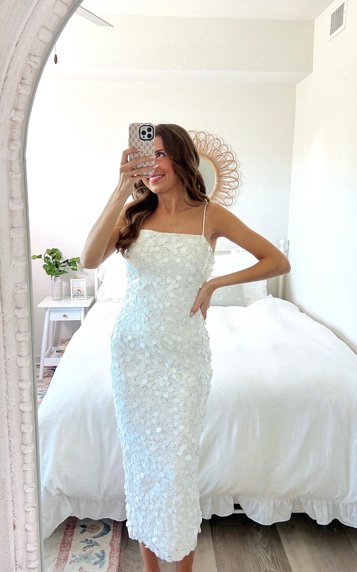 Spaghetti strap large and small sequin mix bodycon midi dress with back slit detail. Lining.