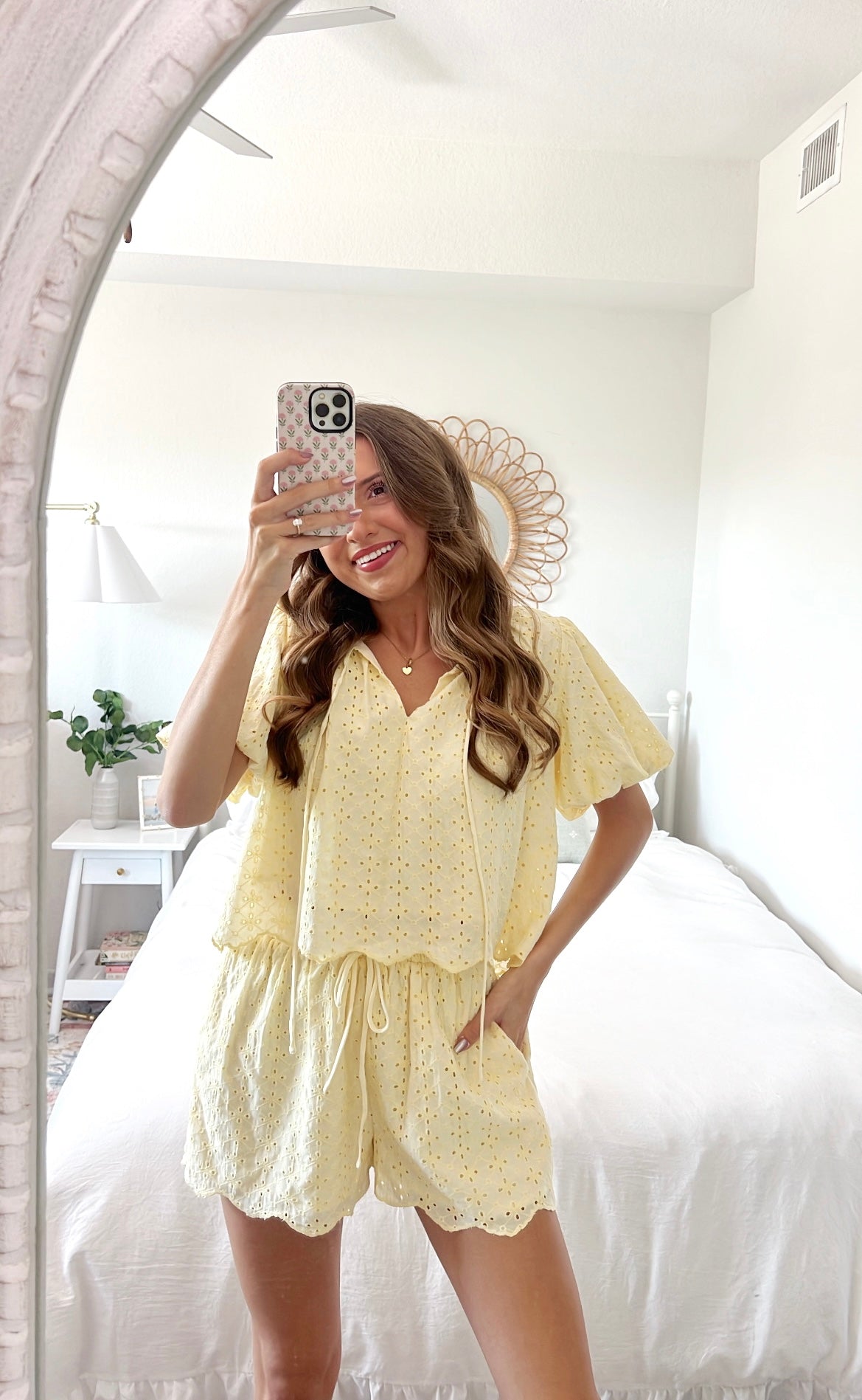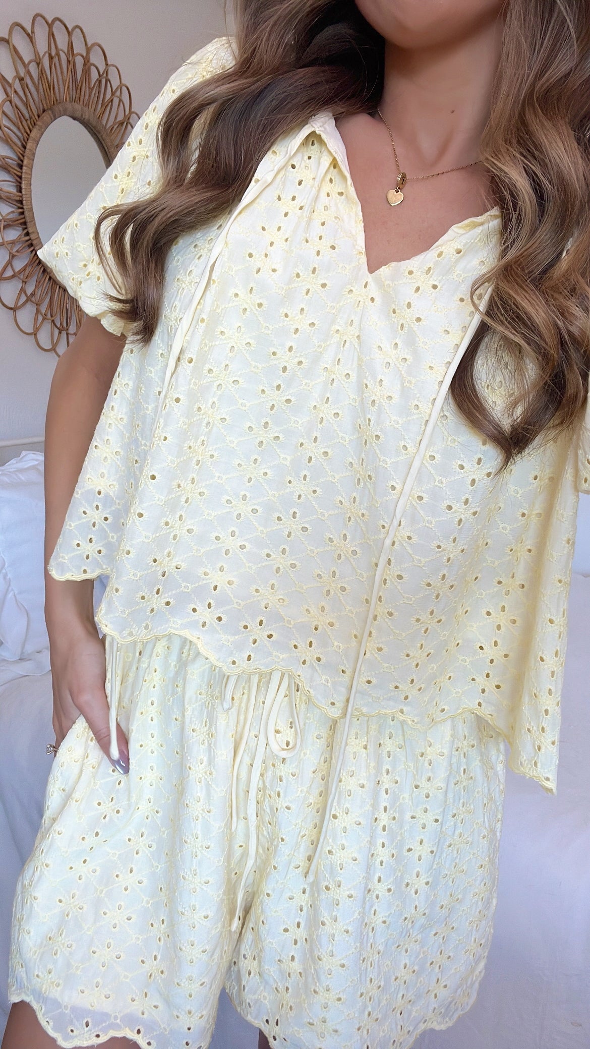 Light yellow solid eyelet lace scallop trim short puff sleeve blouse top and matching drawstring elastic waistband short set. Lining.