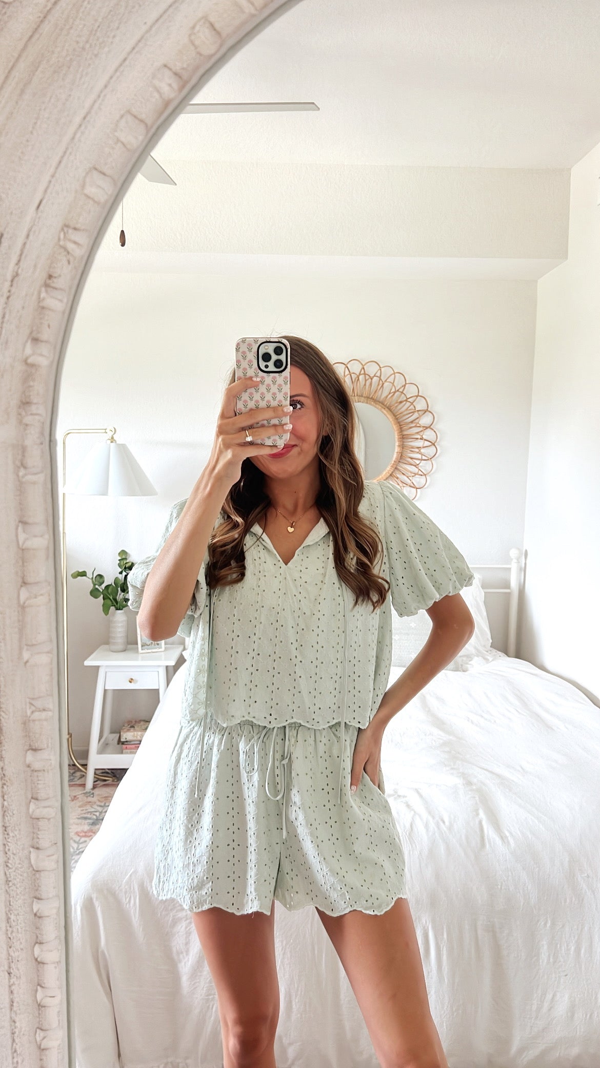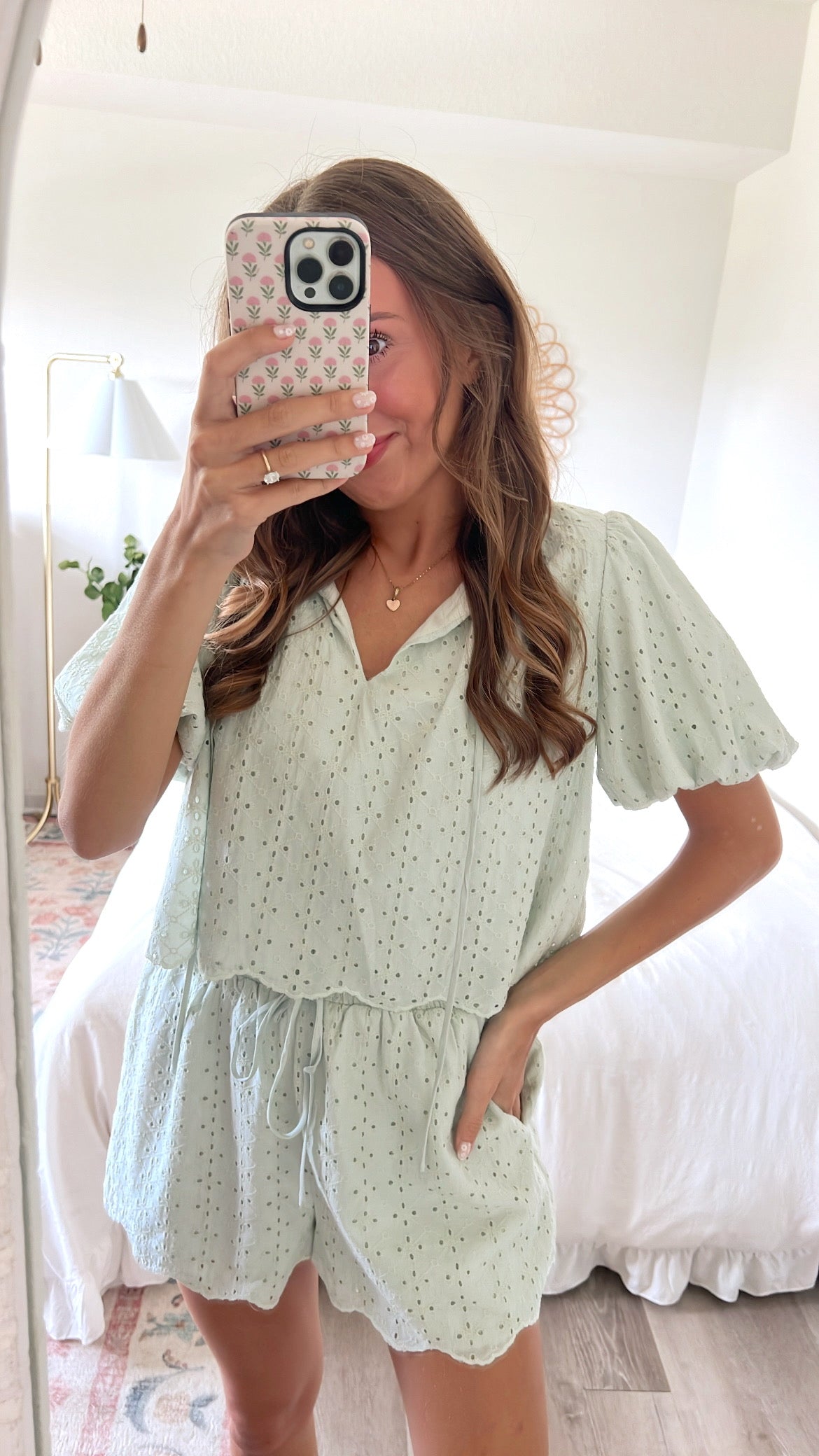 Mint solid eyelet lace scallop trim short puff sleeve blouse top and matching drawstring elastic waistband short set. Lining.