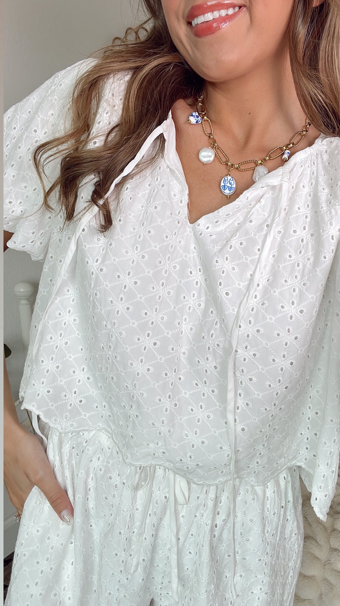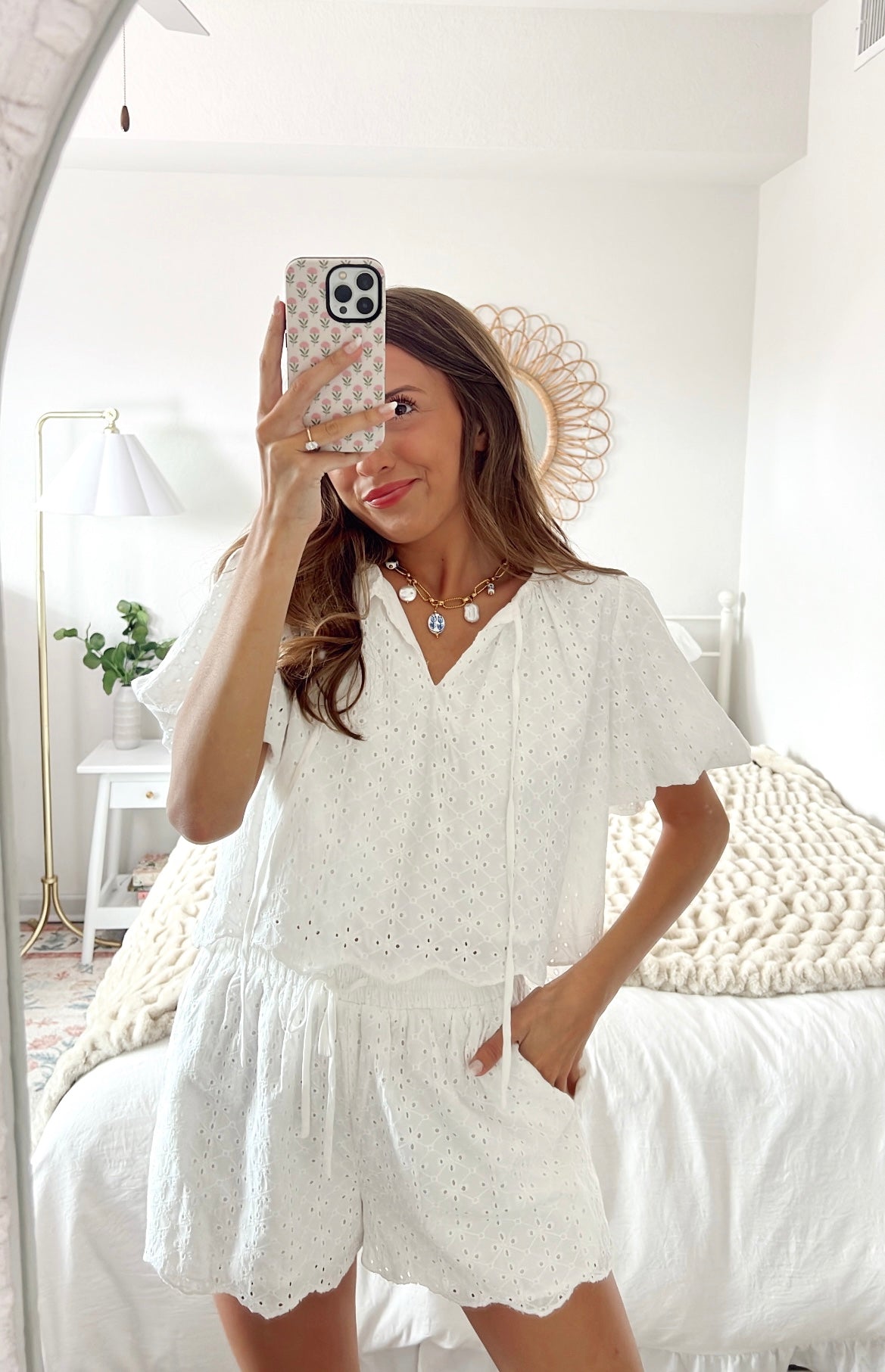 White solid eyelet lace scallop trim short puff sleeve blouse top and matching drawstring elastic waistband short set. Lining.