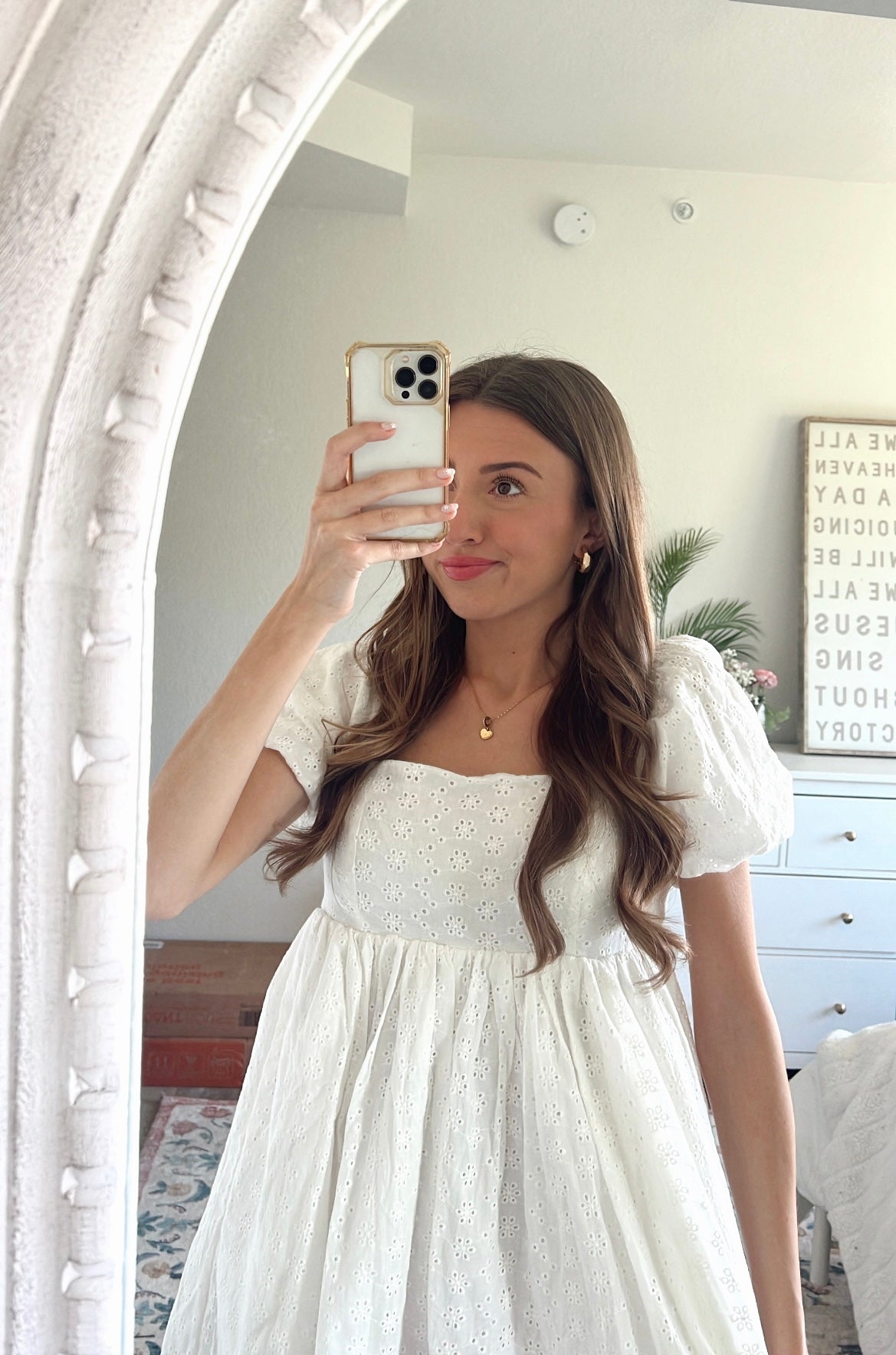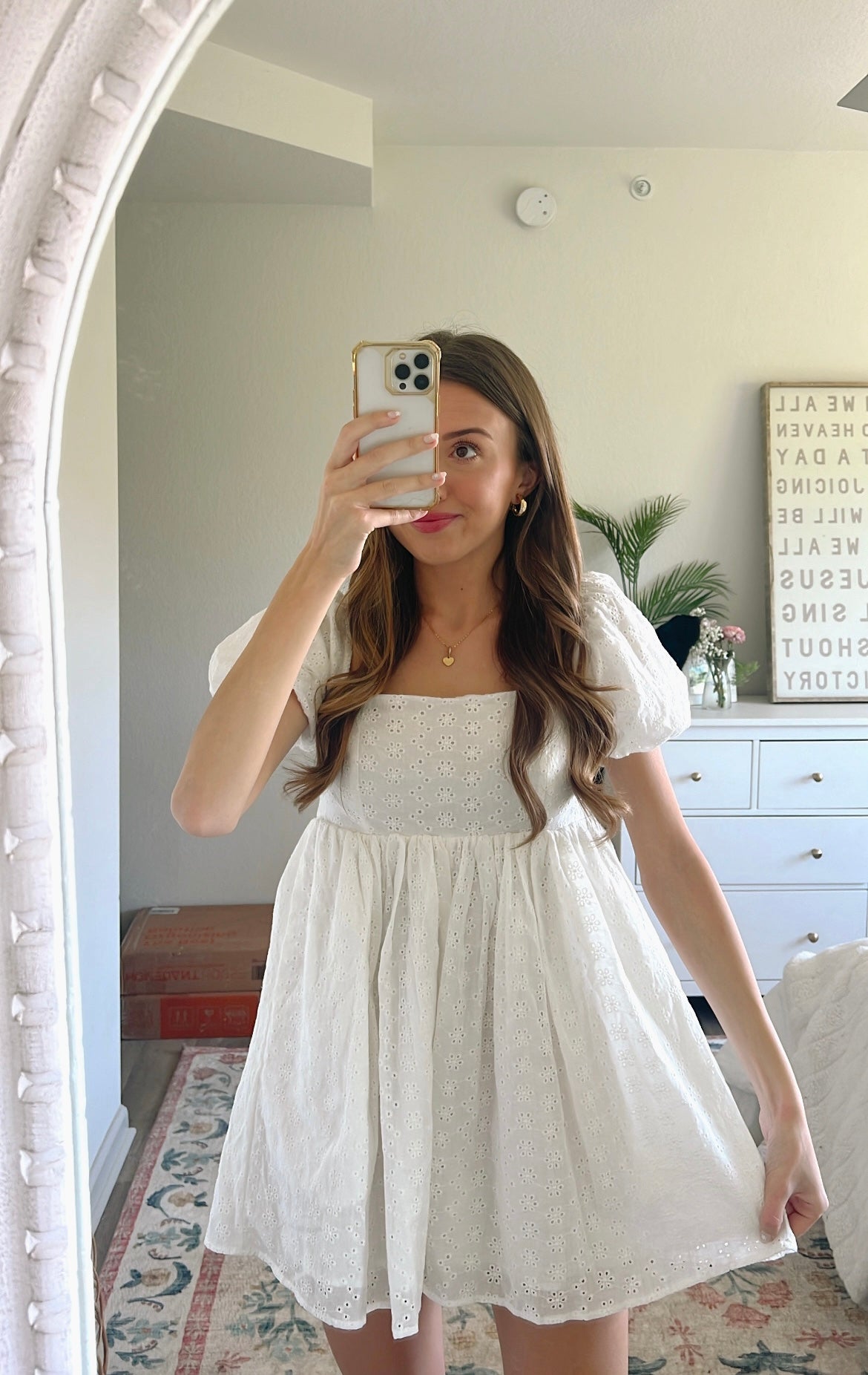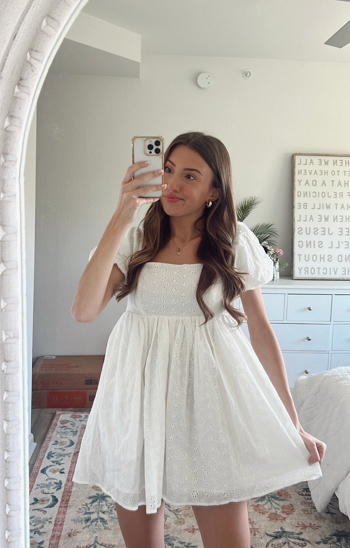 Lined eyelet lace square neckline. babydoll mini romper with puff sleeve and smocked back detailing with invisible back zipper