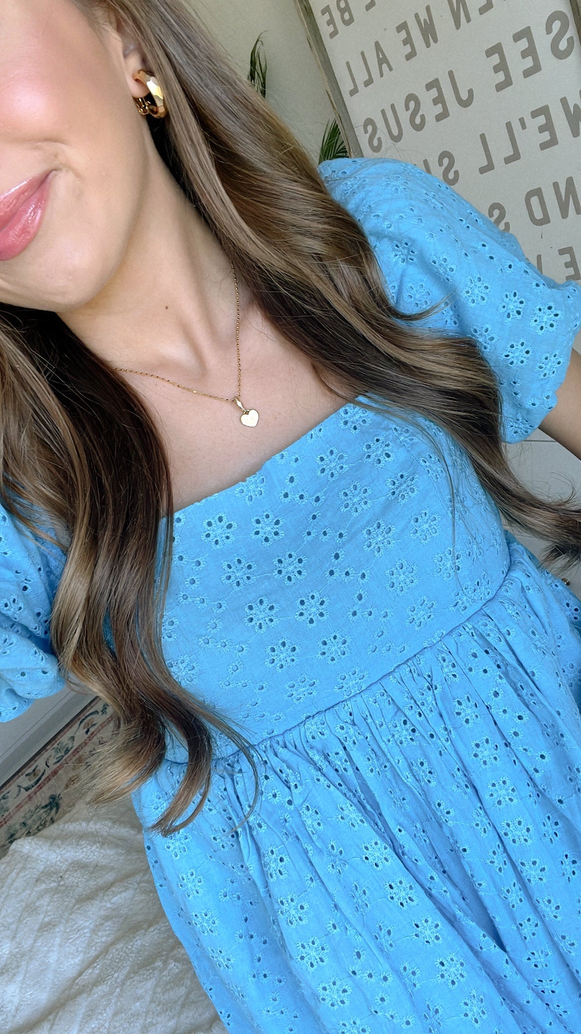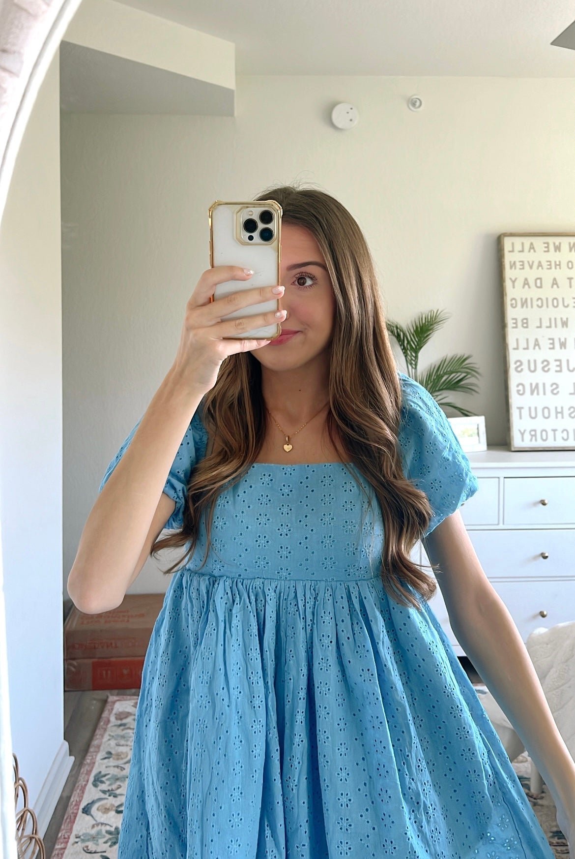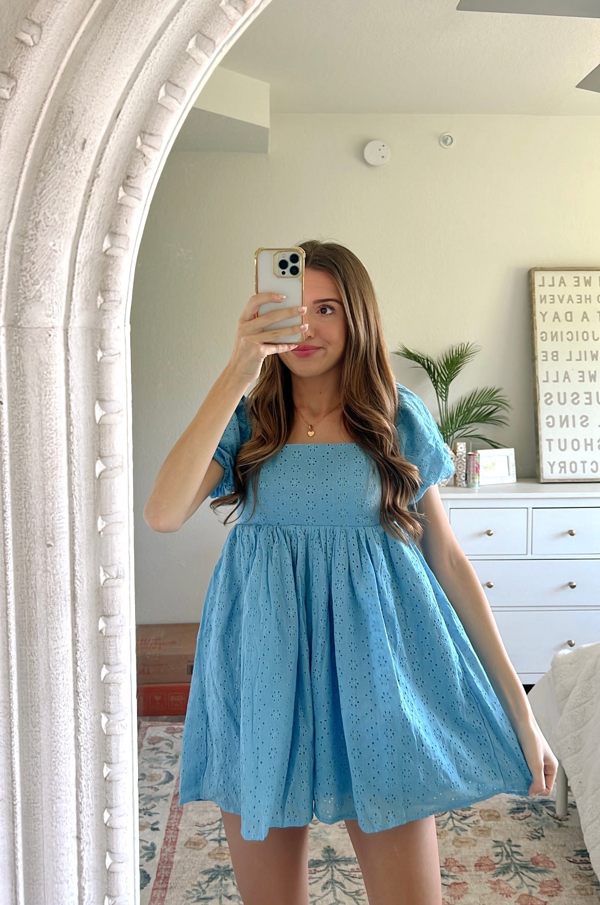Lined eyelet lace square neckline. babydoll mini romper with puff sleeve and smocked back detailing with invisible back zipper