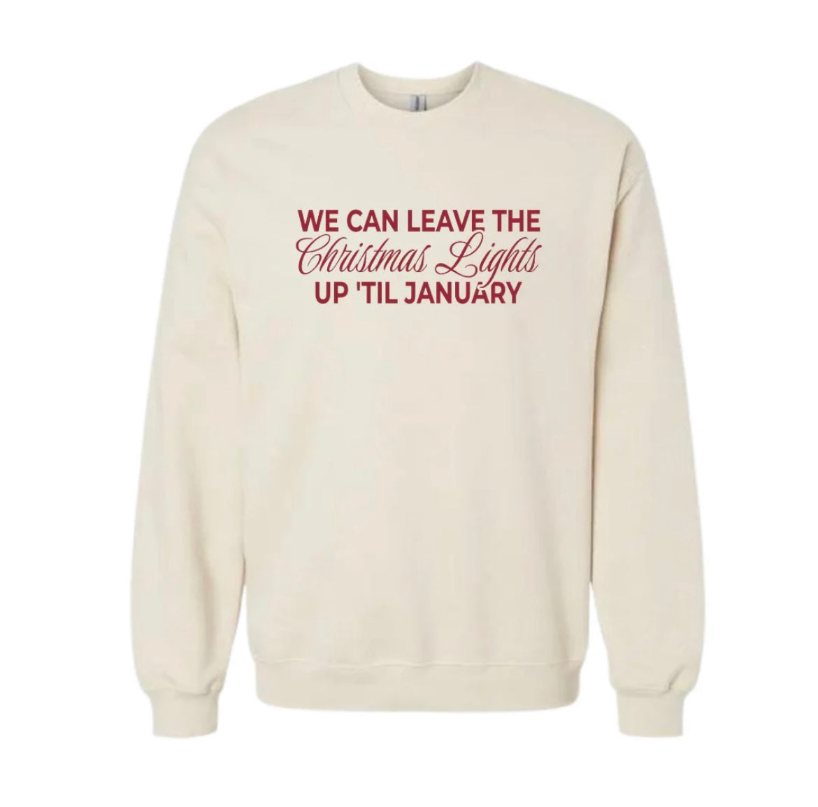 Cream crewneck with burgundy screen print lettering.